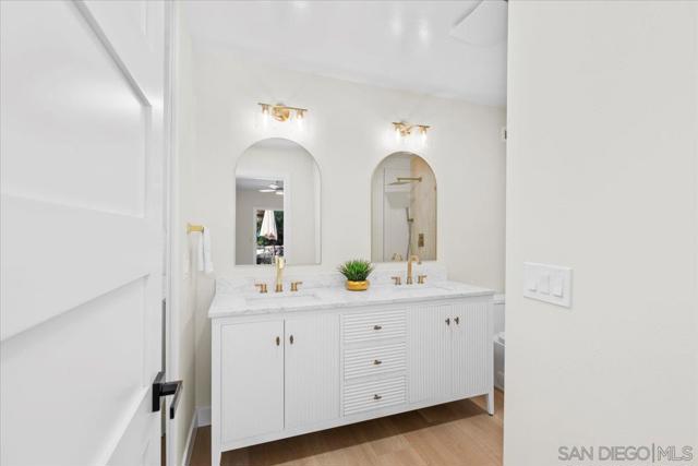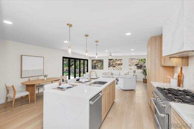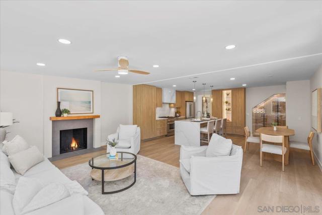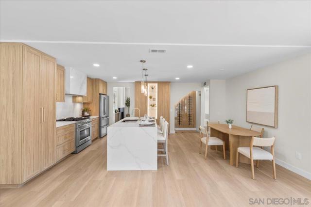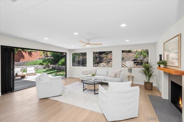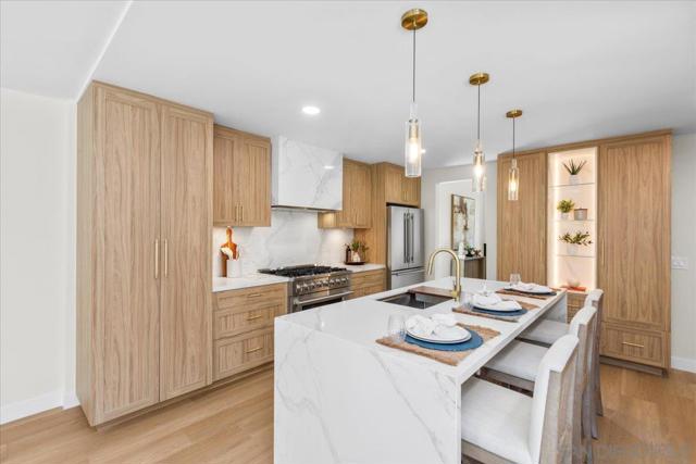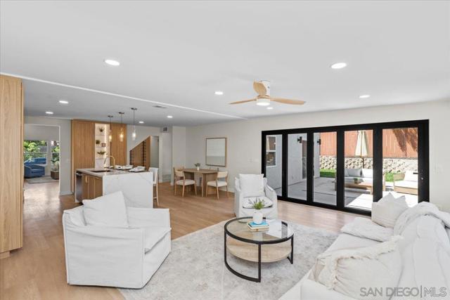Don’t miss this exceptional coastal residence located in the highly desirable Village Park community. This fully remodeled four-bedroom, four-bathroom home showcases modern luxury and thoughtful design throughout, situated on a generous 6,000 sq. ft. lot. Upon entry, you are welcomed by vaulted ceilings and abundant natural light that enhance the open and spacious living area. The gourmet kitchen features waterfall-edge quartz countertops, custom light oak cabinetry, a designer quartz backsplash, and top-of-the-line stainless steel appliances. A large center island with integrated seating and elegant pendant lighting provides the perfect space for everyday dining or entertaining. Expansive 12-foot cantina-style sliding glass doors create a seamless connection between indoor and outdoor living, opening to a beautifully landscaped backyard ideal for relaxation or gatherings. Wide-plank luxury vinyl flooring and a neutral color palette lend a sophisticated, contemporary ambiance throughout the home. The flexible floor plan includes primary suites on both the main and upper levels, offering convenience and privacy. Each bathroom has been meticulously updated with custom vanities, designer finishes, and premium fixtures. Located on a quiet street just minutes from award-winning schools, pristine beaches, local parks, shopping, and top-rated dining, this turnkey home offers the perfect combination of style, comfort, and location.