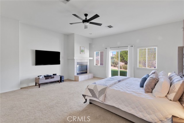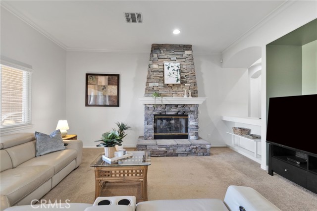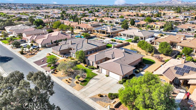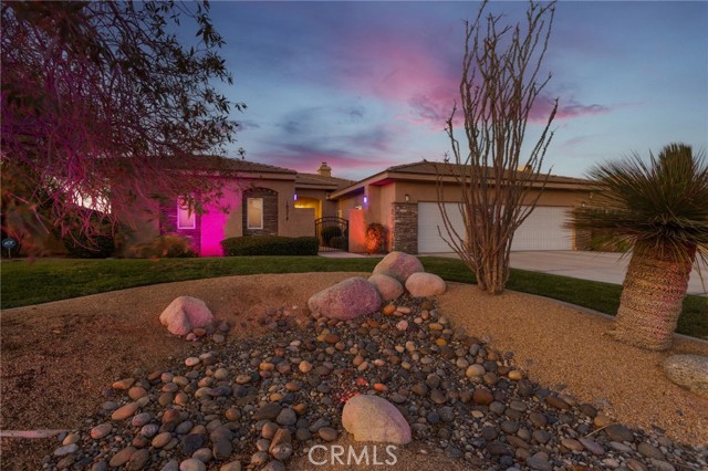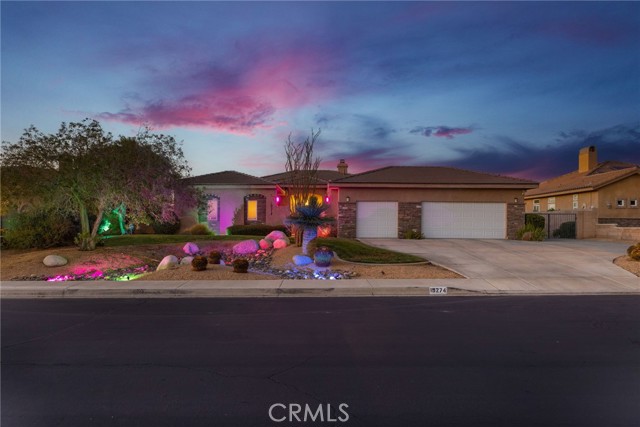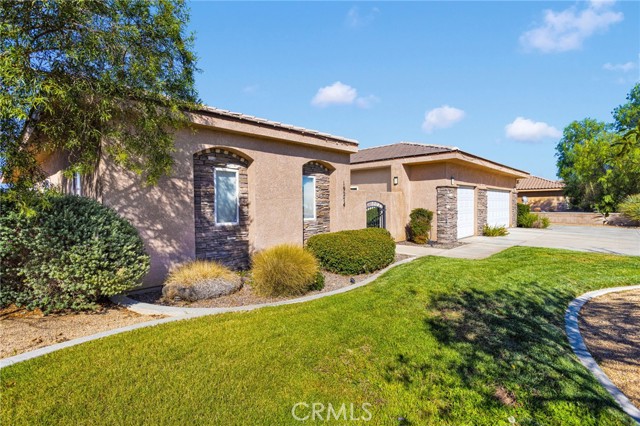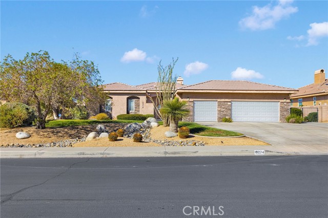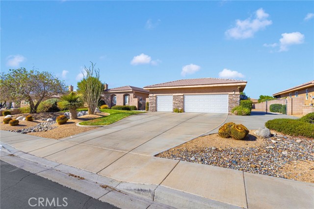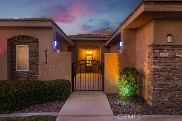 Welcome to 19274 Kanbridge St located in one of the most exclusive communities in the High Desert. Stonebrook Estates. As you walk past the gated courtyard you are greeted with an inviting living room and 12-foot ceilings. A bar nook completes this space perfect for entertaining family and friends. This home features a bright, open floor plan with a beautifully appointed kitchen showcasing granite countertops and a spacious breakfast nook. A formal dining room offers the ideal setting for family dinners or hosting special occasions. The primary bedroom is thoughtfully positioned for privacy, separate from the other bedrooms. It features a luxurious ensuite bath with dual vanities, a jetted tub, a walk-in shower and dual closets - one of which is a walk-in. Enjoy the warmth and charm of not one, but three fireplaces, located in the living room, breakfast nook and primary bedroom. You have an indoor laundry room with storage cabinets. A three-car garage to store your toys. RV parking potential. Outside, both the front and backyard feature low maintenance desert landscaping, providing beauty and ease of care. Home is equipped with solar panels for energy efficiency. Who needs a high maintenance pool when you are a house away from it? Stonebrook Estates offers private security patrol, tennis and pickleball courts, a community pool, clubhouse and is only minutes away from shopping and dining.