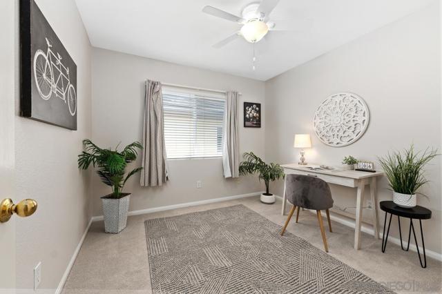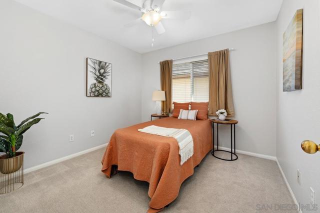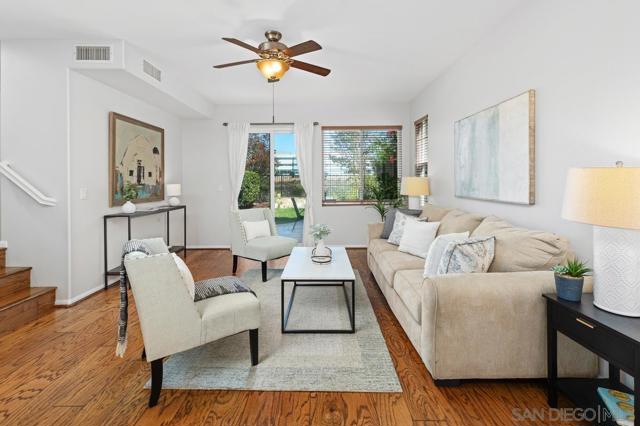 Don’t miss this opportunity to own a beautiful and immaculate 3-bedroom, 2.5-bath townhome, ideally situated in a desirable location at the back of the complex. Enjoy peaceful views from your private backyard, complete with a charming stone patio—perfect for relaxing or entertaining. The home features a spacious living area, separate dining room, and a pristine kitchen with abundant storage and a refrigerator included. Upstairs, the primary suite offers a walk-in closet, accompanied by two generous secondary bedrooms. Notable upgrades include wide plank hardwood flooring, ceiling fans, wood blinds, and central air. The attached 2-car garage includes a washer and dryer. The well-maintained community offers a pool, spa, and small playground for residents to enjoy. Conveniently located near restaurants, grocery stores, community parks, and Lake Miramar is just a short distance away.