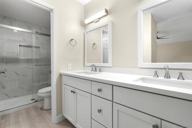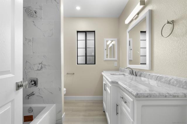 This beautifully remodeled, turnkey tri-level townhome offers every attention to detail in a highly desirable greenbelt setting within the coveted Mariposa community in Del Cerro. Spacious open floor plan at approximately 1,950 sq ft, with vaulted ceilings, fireplace, a stunning new kitchen, new flooring, cabinetry and baths. Lovely, private covered patio overlooking the beautifully maintained greenbelt and open spaces. The primary suite offers a walk-in closet, double vanity, and elegant en-suite bath. Additional highlights include direct access, spacious two-car garage into a versatile bonus space, perfect as a mudroom, storage area, or dedicated laundry room. The Mariposa community features a lovely pool and spa in garden setting with low HOA fees and a prime Del Cerro location near Mission Trails Park. A truly exceptional, immaculate home blending comfort, style, and convenience. Please note: Images 25 through 32 are VIRTUALLY STAGED photos.