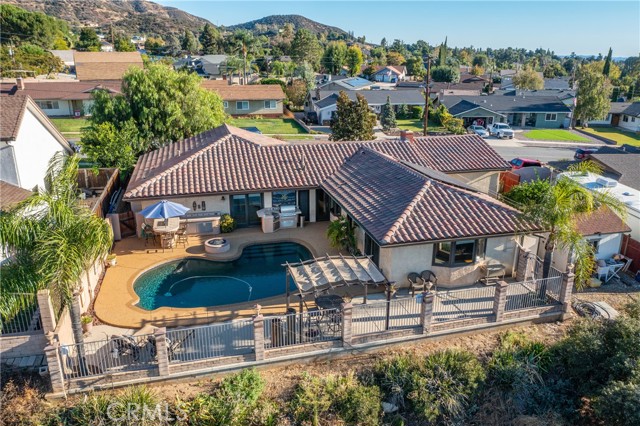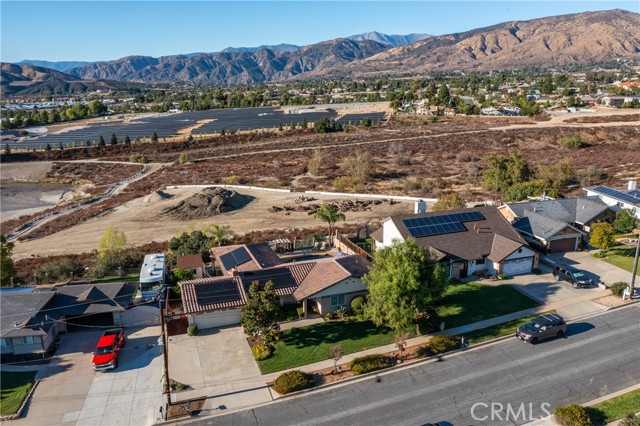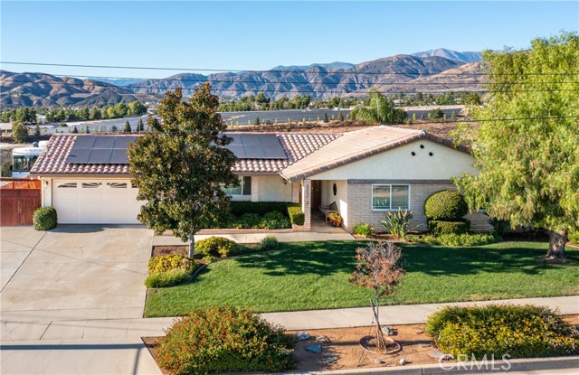 Pictures simply don’t do this home justice with its unbelievable, unobstructed mountain views! Paid for solar! This home has been lovingly cared for by the same owners for over 30 years, showcasing true pride of ownership around every corner. This beautifully maintained 3 bedroom, 2.5 bath home located in a quiet, well established neighborhood. Inside, you’ll find upgrades throughout, the front living room has custom built-in cabinets with a remote operated gas fireplace. There are also boxed wood shutters, Pella windows and doors, and Cat 5/6 internet wiring extending throughout the home for modern convenience. The master suit has clean and comfortable carpet with a mirrored three paneled sliding door and mountain views through a custom sliding glass door with access to the pool. The master bathroom has been remodeled with a walk in shower and custom tile work. It has a large vanity with double sinks and a granite counter top. Step outside to your own private retreat featuring a newly Pebble Tech salt water pool , built-in outdoor kitchen, and BBQ area that’s perfect for entertaining and soaking in the views. The paid-for solar and new roof offer long-term savings and peace of mind. The spacious side yard features a shed, mature fruit trees and room for a garden or swing set. Don’t miss the chance to own this rare view property where comfort, care, and breathtaking scenery come together.