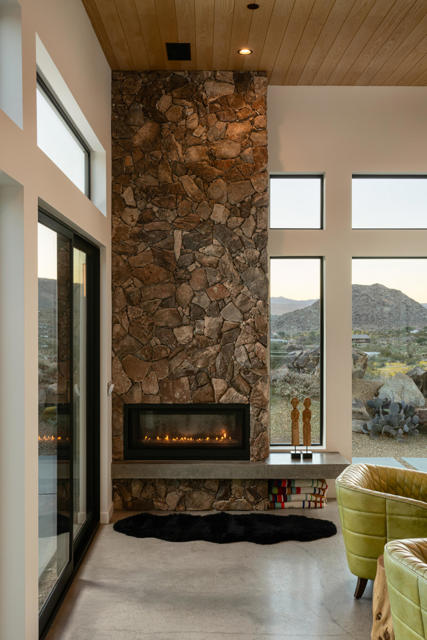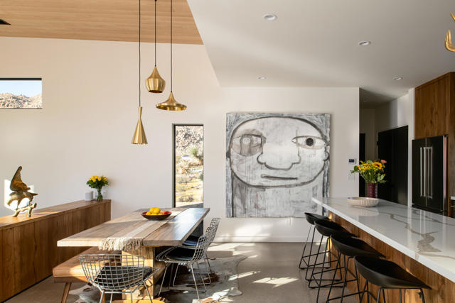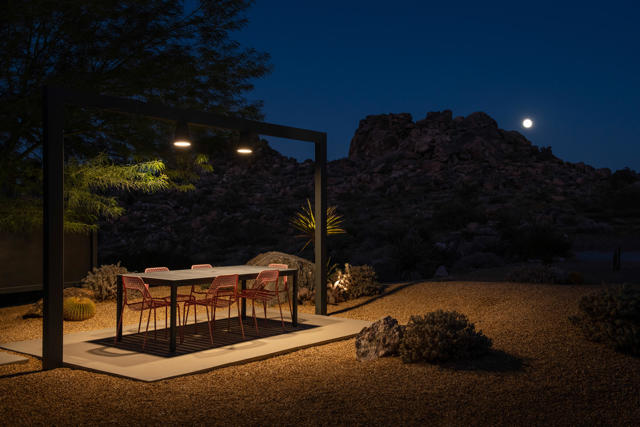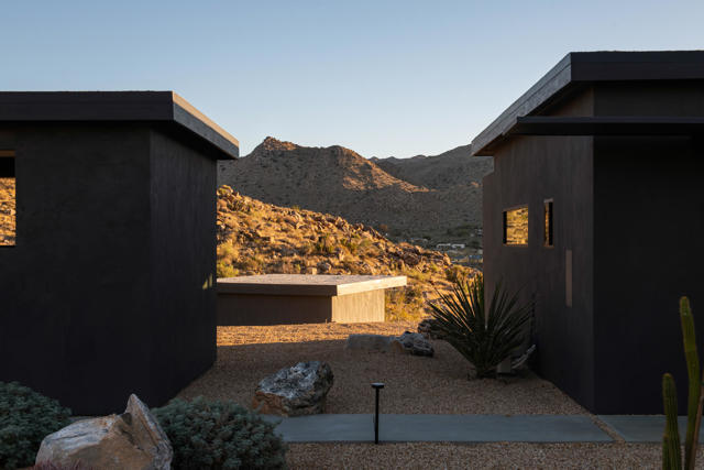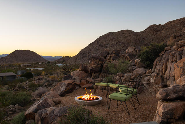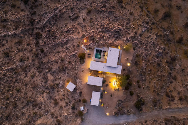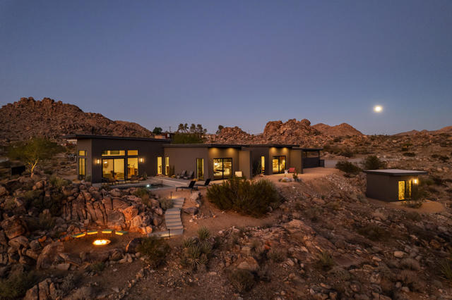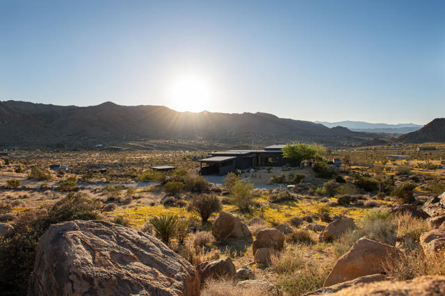 Modern desert living awaits at 8520 Purple Sage Road. Tucked among the iconic boulders of Joshua Tree, this sleek architectural retreat sits at the very end of a quiet road, perched high against the mountains with a rare sense of privacy, yet just minutes from the west entrance of Joshua Tree National Park.Completed in 2021 with meticulous attention to detail, the property blends minimalist design with natural warmth. The main house centers around an open living space anchored by a sculptural fireplace and a custom Heath-tiled kitchen and baths, while a dramatic natural rock wall and expansive glass capture the ever-shifting desert light. A detached guest house and additional studio offer flexible space for guests, creative work, or quiet retreat.Set on over two acres, the grounds feature a private pool and spa with some of the most captivating views in the desert, an outdoor shower, multiple seating areas, a fire pit, and sculptural desert landscaping designed for connection and calm. Equally suited as a full-time home, weekend escape, or high-performing short-term rental, 8520 Purple Sage is a rare intersection of architecture, light, and landscape in one of Joshua Tree's most coveted settings.