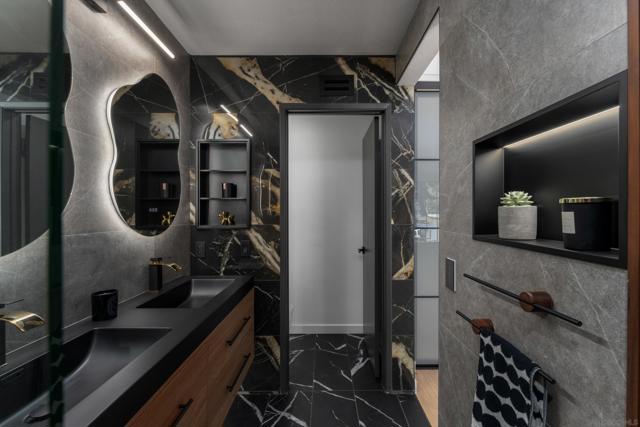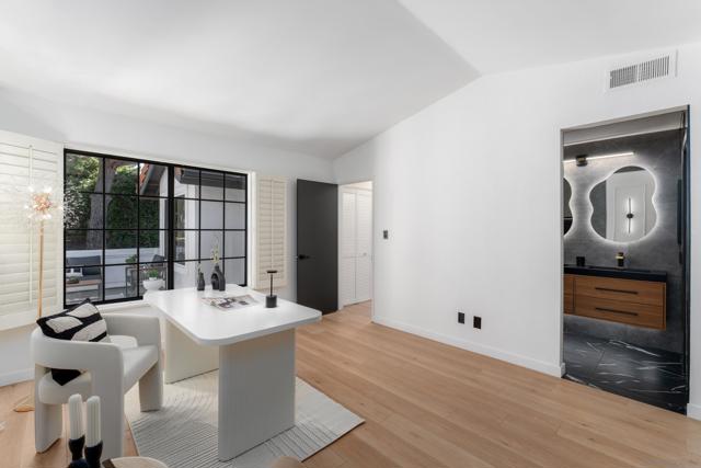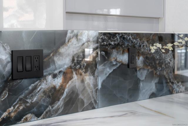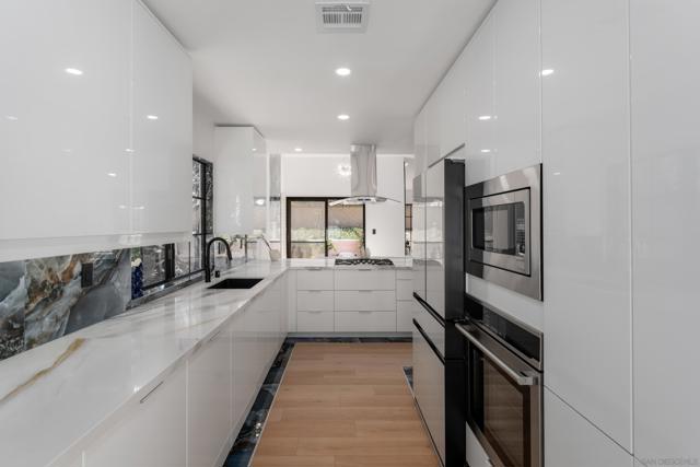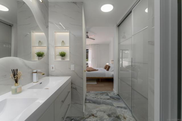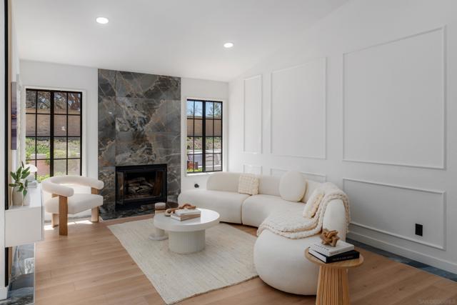 Welcome to “Ocean & Sand” Designer Home with One-of-a-Kind European Luxury Remodel. This single-story residence in a prime Del Mar highlands location is not a typical home. It is thoughtfully curated designer’s residence fully renovated with style and intention. Lives like a single-family home, no neighbors behind and to the left. High vaulted ceilings in the living room and bedrooms. Two spacious primary suites, each with its own full bathroom. Hand picked luxury tile from Spain & Italy. Open concept kitchen with a European style cabinets, modern quartz countertop, dramatic stone waterfall and backsplash. Kitchen offers built in stove, oven, microwave, dishwasher and ambient under cabinet lightning. The dining room is a showstopper with floor to ceiling porcelain tile accent wall. Unique kitchen and living room custom tile-to-laminate edge design. Living room area features gas fireplace with floor to ceiling porcelain tile and a custom design TV wall. New Roof replaced (2025), newer furnace (2023). The Pinterest looking Spa-Like bathrooms All Tile design. Both have custom shower systems, double floating vanities, ambient lighting, LED mirrors, and a smart toilet with integrated bidet functions. Two-car garage has epoxy flooring, laundry space located inside the home. Perfect size courtyard and private backyard. The community offers pool and spa. Walking distance to One Paseo, Del Mar Highlands Plaza, Sky Deck, shops, cafés, top-rated restaurants and Solana Highlands Elementary School. The beach is 10-min drive.