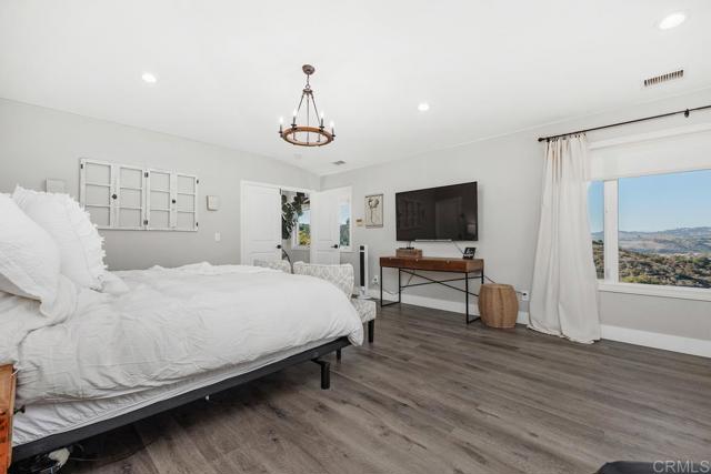 Stunning, fully renovated 4-bedroom designer ranch estate on over 2 acres of lush, mature landscaping. This home blends luxury, comfort, and functionality with an open, light-filled layout ideal for entertaining and everyday living. The gourmet chef’s kitchen features top-of-the-line appliances, white quartz countertops, a large center island, white cabinetry with glass accents, a charming dining area, and a spacious walk-in pantry. Skylights and expansive glass doors frame breathtaking mountain views and create seamless indoor-outdoor flow. The living room boasts a striking coral stone fireplace and direct access to the backyard oasis, perfect for dining, relaxing, or entertaining.The luxurious primary suite occupies its own private second floor, offering a true retreat with large walk-in closet, and sweeping views of the estate and surrounding mountains. Three additional bedrooms provide flexible space for family, guests, or a home office. Every inch of the home showcases designer finishes, custom detailing, and elegant touches throughout. Outdoors, enjoy a private resort-style yard with a patio deck for BBQs and al fresco dining, surrounded by nearly 100 mature fruit trees including cherimoya, guava, mango, satsuma oranges, Logan, golden navel mandarins, Oro Blanco, and finger limes. The property is sustainably powered by an owned solar system and features a two-car garage. Nestled at the end of a quiet cul-de-sac, this rare estate combines privacy, elegance, and serenity while remaining conveniently close to I-15 and I-76.