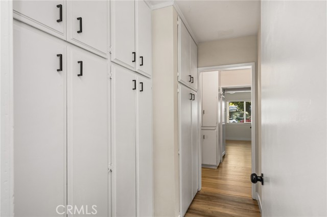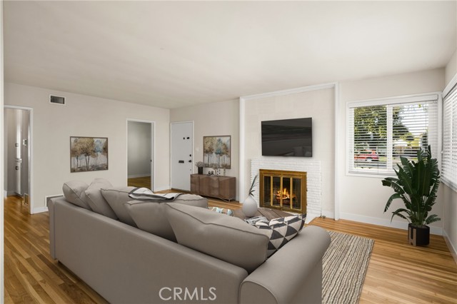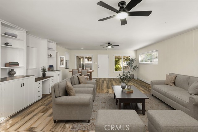 Wonderfully upgraded Mid-Century home on a beautiful tree lined street in the sought after neighborhood of Park Santiago! This adorable turnkey home blends classic Mid-Century design with modern upgrades giving you the best of both worlds. Entering the home you will find a spacious living room with gas fireplace and extensive hardwood flooring that has just been refinished. The huge SEPARATE family room boasts approximately 565 square feet of living area with a pass through window from the kitchen, new vinyl plank flooring and two new ceiling fans with remotes. Each of the 3 bedrooms has refinished hardwood flooring and new ceiling fans with remotes. One bedroom has a custom built in desk while the primary bedroom has dual sets of closets and an en suite bathroom. This classic home features new interior paint, extensive hardwood flooring, energy efficient upgraded dual paned windows, custom built in pantry, new vinyl plank flooring complemented by new baseboard moldings, an upgraded kitchen with granite countertops, new oven/range, new microwave, new dishwasher and tray ceiling with recessed lighting. Additional features include central heat and air conditioning, whole house attic fan, extensive built in shelving and more. The separate dining room has sliding glass doors which open to a large covered patio perfect for entertaining. The backyard has a block wall fence laced with ivy, planter boxes, fruit trees and plenty of room for the kids or pets to roam! Just a few blocks away you can explore Santiago Park with tennis courts, basketball courts, a playground and more. The home is in close proximity to Main Place Mall, the famous Bowers Museum, the Discovery Cube Science Museum, first class medical facilities, major transportation routes, local entertainments, dining and much more. The home has been virtually staged.