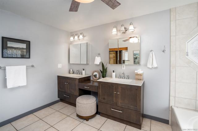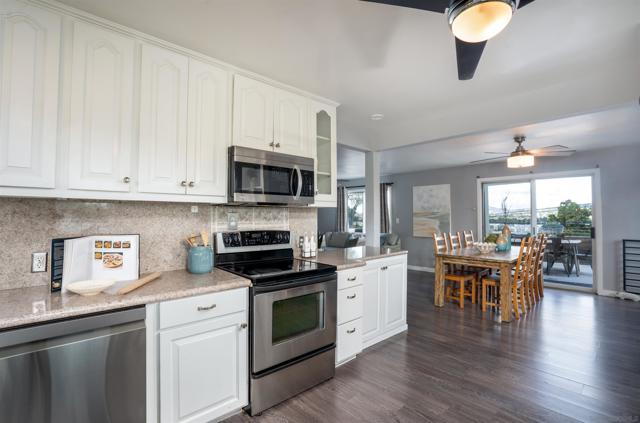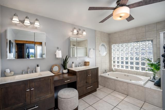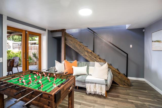 This beautifully updated two-story residence offers a spacious and inviting atmosphere. The open-concept kitchen features sleek countertops and modern cabinetry, seamlessly connecting to the dining and family rooms, ideal for both everyday living and entertaining. Large windows throughout the home allow for an abundance of natural light, creating a bright and airy ambiance. The private master suite boasts a walk-in closet and an ensuite bathroom for added comfort. Downstairs, a separate living area with a kitchenette, den, and two bedrooms provides flexibility for guests or extended family. Step outside to the beautifully remodeled patio and pool area, complete with seating areas, an outdoor fireplace, and a firepit, perfect for gatherings and relaxation.