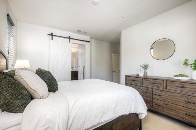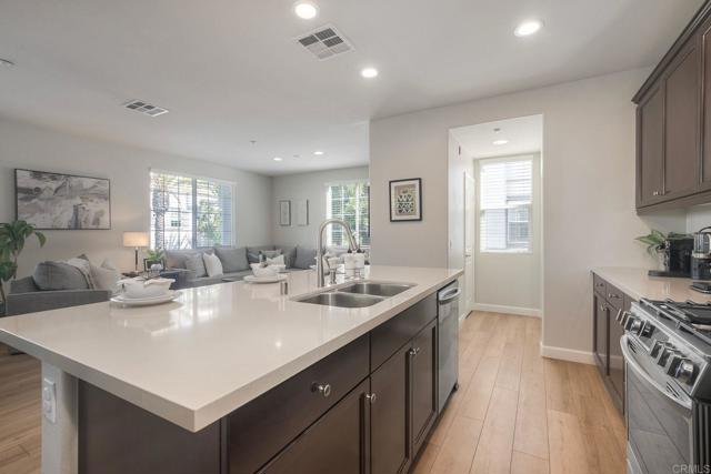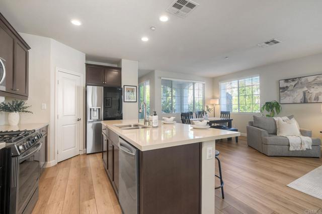 Welcome to this beautifully maintained END-UNIT home in the desirable Magnolia community of Old Creek Ranch, San Marcos! This spacious residence lives like a townhome-style condo, with no one living above or below you, offering 3 bedrooms, a versatile BONUS ROOM, and an ATTACHED 2-car garage. The entry-level bonus room with its own bath, is perfect for a home office, gym, or guest space. On the main level, you’ll love the open-concept layout featuring a well-appointed kitchen with a large center island and bar seating — ideal for entertaining. Enjoy newer 2024 appliances, stunning quartz countertops, warm-toned cabinetry, and a walk-in pantry. Natural light fills the living areas, and the private balcony with pool views provides a cozy outdoor retreat. A powder room and a laundry closet with full-size stackable washer and dryer add convenience. Upstairs, the primary suite offers comfort and style with an ensuite bathroom, while two additional bedrooms share a Jack-and-Jill bath. The attached oversized garage provides extra storage and includes a 220v outlet for EV charging. Residents of Magnolia enjoy resort-style amenities including a pool, spa, BBQ area, and tot lot. Ideally located just minutes from San Elijo Hills Town Center, award-winning schools, local trails, dining, and shopping — this is North County living at its best!