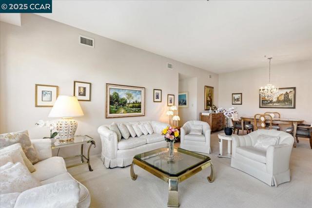 Step into this elegant East-facing Waterford Filoli model penthouse with an open-concept living and dining area that seamlessly extends to a private balcony, perfect for relaxing or entertaining under the open sky. The kitchen, complete with a cozy breakfast nook, offers the perfect place to start your day. Down the hallway double doors lead to a luxurious primary suite with a walk-in closet and private toilet and shower room. The large second bedroom is adjacent to the hall bathroom that features a bathtub and stacked washer/dryer. Conveniently located next to elevator #1 in the North building with only one shared wall. This unit has one of the few under-building parking spaces. Meticulously maintained and move in ready. Condo is offered fully furnished, if desired. The Waterford monthly dues include one meal daily in the dining room and housekeeping service once a week.