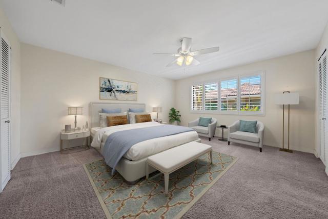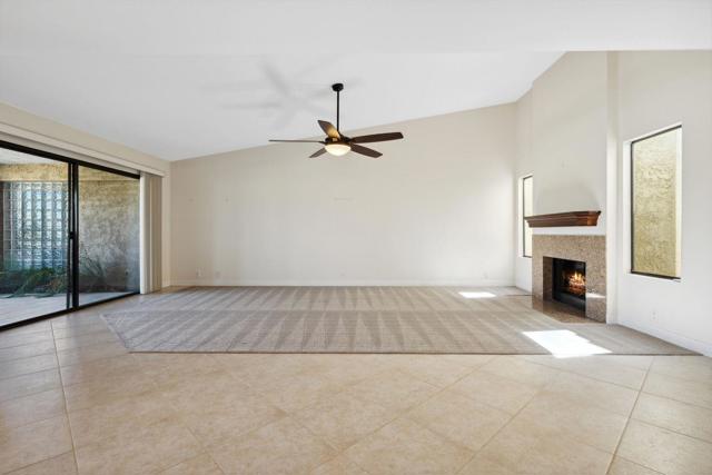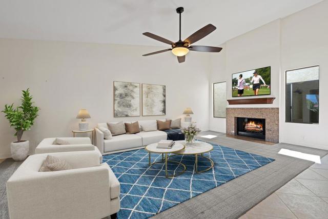 Beautiful 3BD/3BA home on the golf course in Chaparral Country Club! This spacious open-concept floor plan offers two primary suites plus a third bedroom and bath ideal for family, guests, or as a great investment opportunity. The updated kitchen and bathrooms, including a walk-in bathtub, add comfort and style, while the kitchen opens to the dining and living areas for a true great-room feel. High ceilings, a cozy fireplace, and sliding glass doors lead to a large covered patio overlooking the 6th fairway perfect for relaxing or entertaining. Chaparral Country Club offers resort-style amenities including a Ted Robinson 18-hole executive golf course, 21 heated pools and spas, lighted tennis and pickleball courts, and a fitness center, all conveniently located in the heart of Palm Desert, close to shopping, dining, and entertainment. Leased solar about $145.00 per month