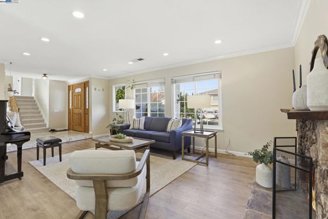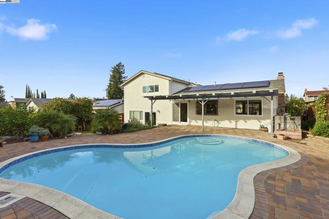 Located in a quiet court, this home features a spacious formal living room with a wood-burning fireplace and crown molding. The updated kitchen includes granite slab counters, a large pantry, soft close doors and new drawers, and Italian and German high end stainless steel appliances. The master suite offers a walk-in closet, while the remodeled master bathroom boasts granite counters and a tile backsplash. The guest bathroom has been updated with travertine. The family room and wet bar have been newly remodeled. Beautifully upgraded backyard with a sparkling pool, newly plastered in 2022, outdoor firepit and speakers, new paver decking, and new artificial turf, owned solar, new electrical panel, new lighting in every room including recessed lights in living room, new hvac system, newly carpeted throughout, laminate flooring in Living room and family room, water softener, and more!