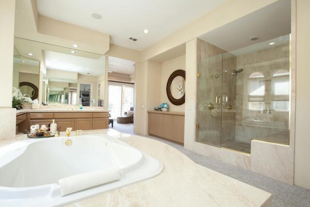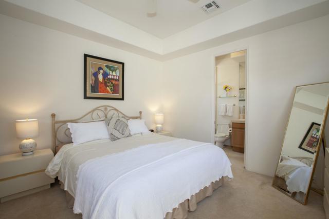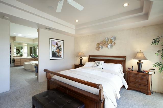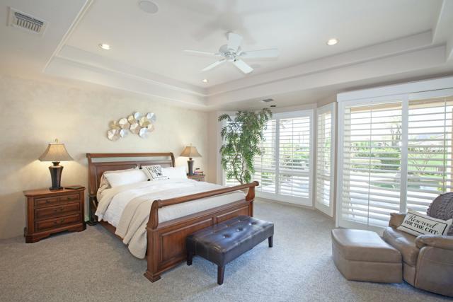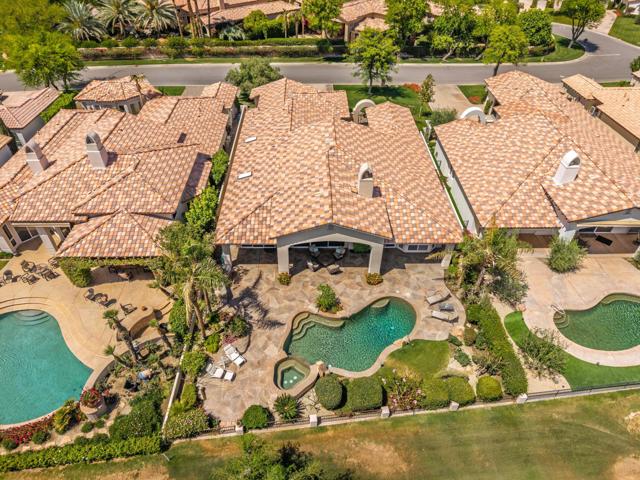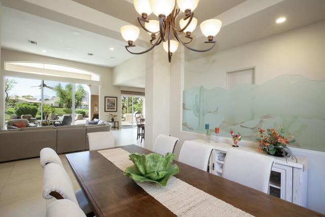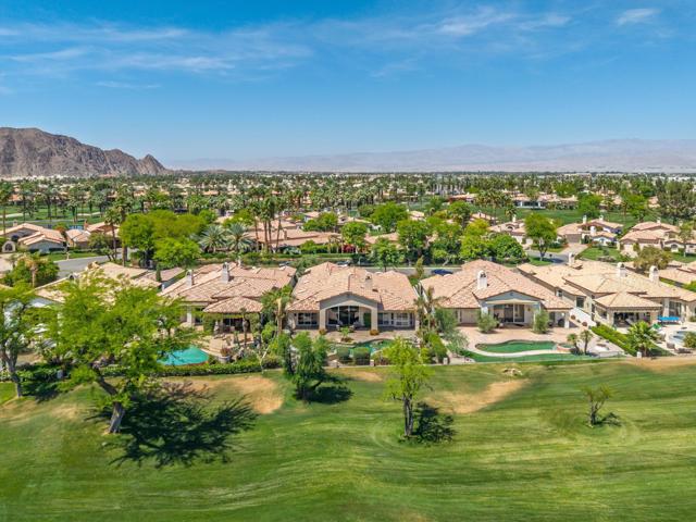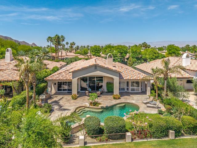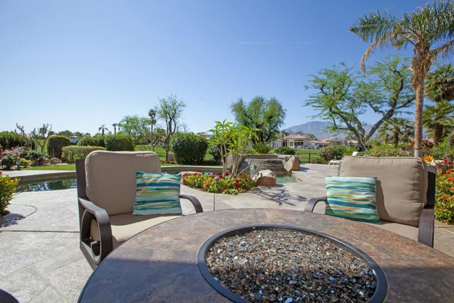 Experience elevated desert living in this south-facing Montana I floor plan, perfectly situated to capture sweeping panoramic views of the Santa Rosa Mountains and the 18th fairway of the Robert Trent Jones Jr. Championship Golf Course. Blending timeless desert elegance with modern comfort, this residence offers an ideal setting for relaxation and effortless entertaining. Located on a quiet cul-de-sac, the home's beautiful curb appeal and generous lot size create a sense of arrival, privacy, and space.A dramatic arched walkway leads to a tranquil private courtyard that connects the attached guest casita to the main home. Inside, a wall of glass frames breathtaking scenery from the spacious great room, offering seamless indoor-outdoor living. Whether dining, relaxing, or enjoying the evening glow across the mountains, the vistas of lush fairways and rugged silhouettes enhance every moment.The expansive entertainer's patio is designed for comfort and style, with a custom curvilinear pool as the focal point. The large deck features a beautiful overlay finish, complemented by an elevated stack-stone spa--perfect for unwinding under the desert sky. A built-in BBQ with bar seating creates an inviting space for gatherings, while a low-profile fence maintains the openness of the views and allows pets to enjoy the outdoors safely. The remodeled kitchen (2014) is well-appointed for the cook who enjoys both function and design, featuring a large center island, slab granite countertops, Viking range and hood, KitchenAid refrigerator and dishwasher, and elegant waxed-glass cabinet door fronts. The great room exudes warmth and sophistication with a custom stone tile fireplace, built-in entertainment wall, and refined custom window coverings. The primary suite is a luxurious retreat with peaceful mountain views and a spacious bath offering dual vanities, a deep soaking tub, oversized shower, and generous walk-in closet. All bedrooms are en-suite, providing comfort and privacy for family and guests. The attached guest casita offers exceptional flexibility and independence with direct access to the courtyard. Additional features include a two-car garage plus golf cart garage, and the home is offered furnished per the Inventory List. With resort-style amenities, exceptional views, and a premium location within Rancho La Quinta Country Club, this residence exemplifies the essence of desert luxury living.
