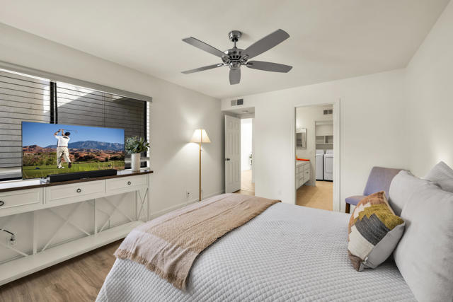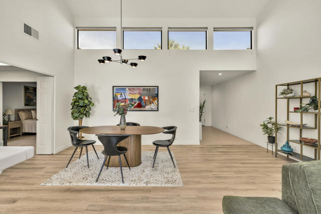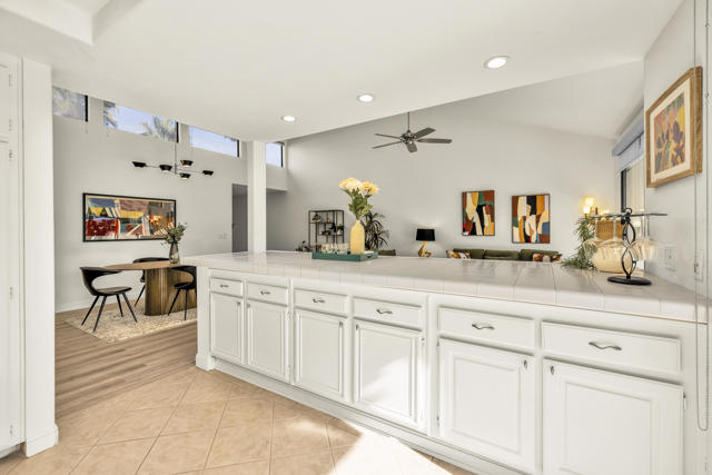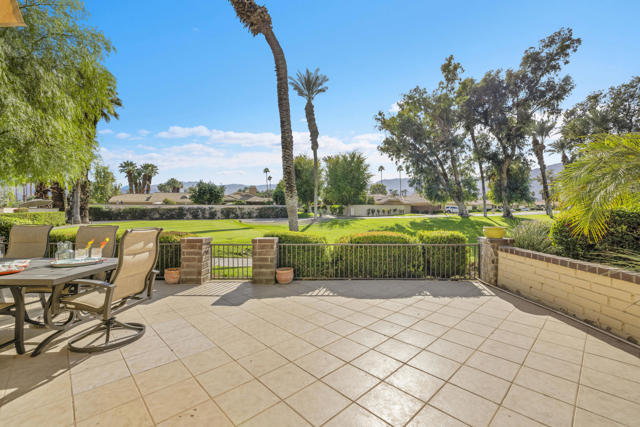 This two-bedroom, two-bath home also offers a great den/flex space and sits in a prime spot at the end of the street. With ideal south exposure, the home has seen thoughtful updates. The atrium has been converted into a cozy office/TV room just off the spacious primary bedroom, which includes two closets and a beautifully remodeled, modern primary bath.The kitchen is large and open, with fantastic storage, new appliances, and a generous island that opens to the living room--perfect for everyday living and entertaining. Luxury vinyl plank flooring has been installed throughout, replacing all carpet.The south-facing patio overlooks the men's 9th tee of the South Ted Robinson course in a location that avoids golf ball concerns. The patio has been expanded and tiled, and retractable awnings offer comfort on sunny days. The view is truly exceptional, stretching down the fairway with the mountains as your backdrop.