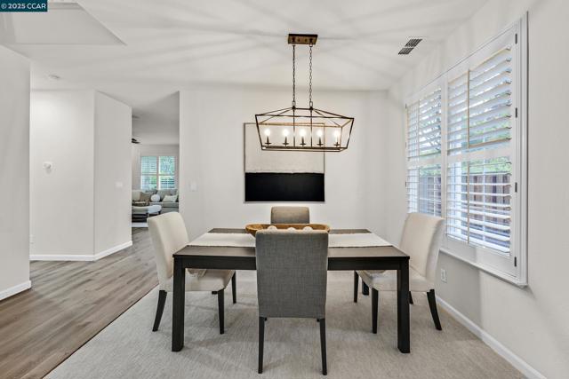 Located in one of Danville’s most sought-after neighborhoods, California Meadows, this beautiful home sits at the end of a serene court on a spacious lot offering privacy and extra land on the side. With 5 bedrooms, 2.5 bathrooms, and an oversized loft, the 2,623 square feet of living space feels open and inviting. The welcoming front porch and striking curb appeal set the tone for the stunning interior featuring soaring ceilings and abundant natural light. The expansive formal living and dining rooms flow seamlessly into the gorgeous kitchen with granite counters, 4-burner gas range, oversized island, eat-in nook, and ample cabinetry, all overlooking the cozy family room with gas fireplace. A dedicated office/den is conveniently located off the family room. Upstairs, the large loft is ideal for a game room or media retreat, while the impressive primary suite boasts a spa-like bath with dual vanities, jacuzzi tub, separate shower, and an oversized walk-in closet. The backyard is a true oasis with a lush lawn, mature trees, and an expansive patio with retractable awning perfect for entertaining. Additional highlights include recessed lighting, plantation shutters, brand new flooring, fresh interior paint, and baseboards throughout. This home is perfection and is move-in ready!