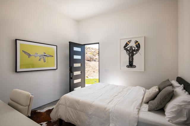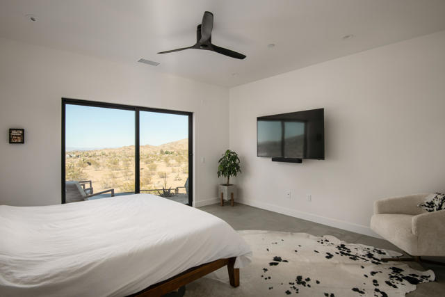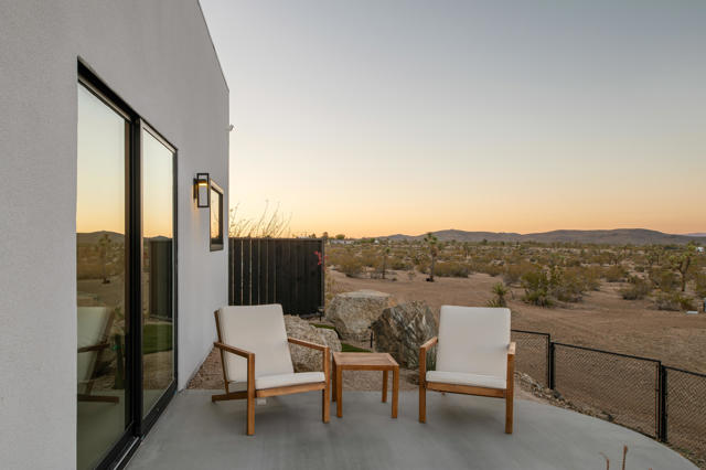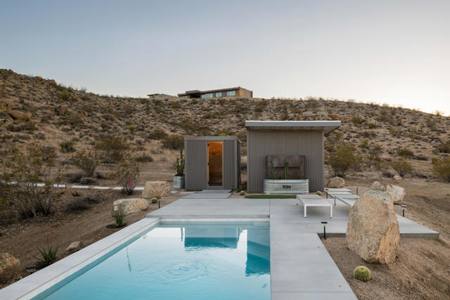 New 2024 architectural home in Yucca Mesa, set in a quiet hillside enclave with big, uninterrupted desert and mountain views. Built to a higher standard, the design is clean, calm, and filled with natural light. The oversized main living room anchors the home. Polished concrete floors and large sliding glass doors on both sides open completely to the landscape, creating true indoor outdoor living and framing the wide horizon. Two serene bedrooms sit at opposite ends for privacy. The main bath is beautifully finished with modern fixtures, natural textures, and soft light. Outside, the sculptural pool is the centerpiece. Set into the hillside and reaching over the desert to catch the sunrise, it invites long afternoons in the sun and quiet nights under a vast sky. A wood-lined sauna and a separate spa style bath add a rare wellness touch. Multiple terraces and a fire pit make gathering simple. Smart home controls manage lighting, sound, climate, and security. Surrounded by other design forward homes and minutes from Joshua Tree National Park, this property offers rare quality, privacy, and scale. Ideal as a primary residence, second home, or short-term rental investment.