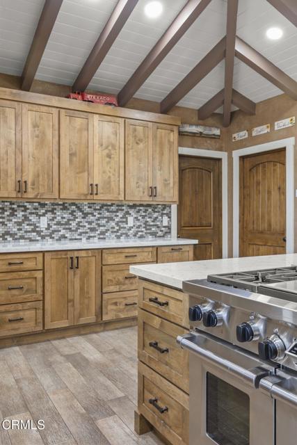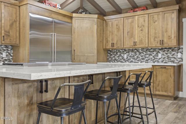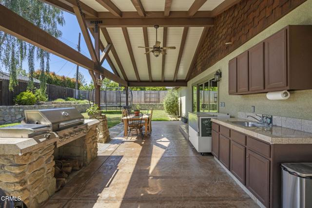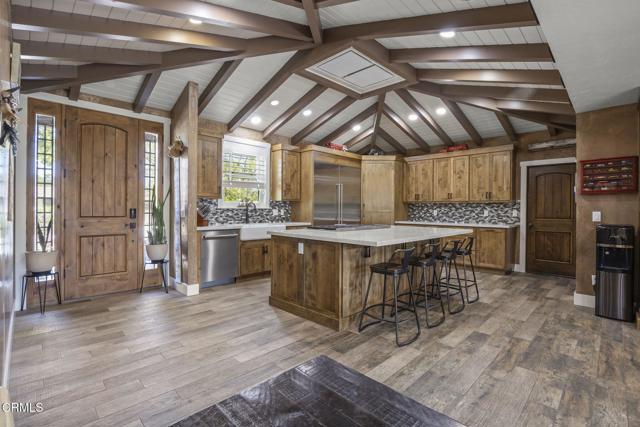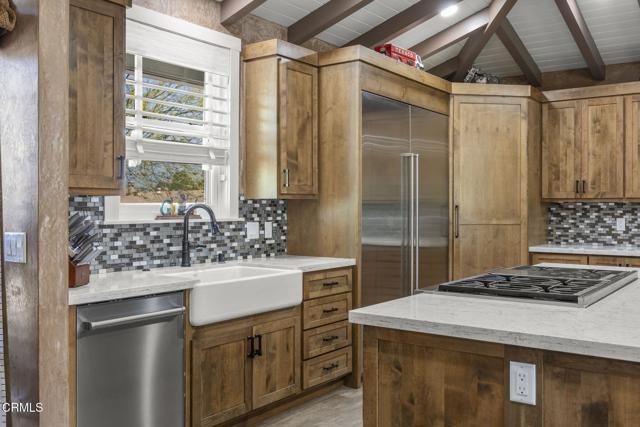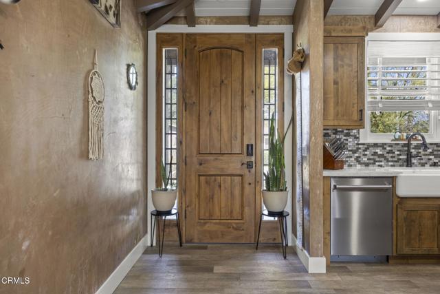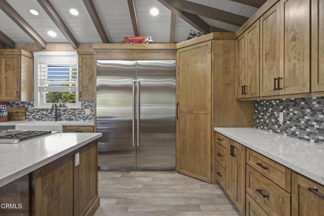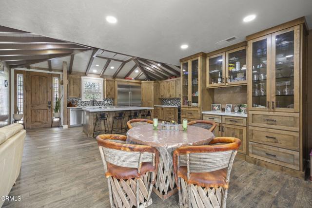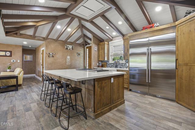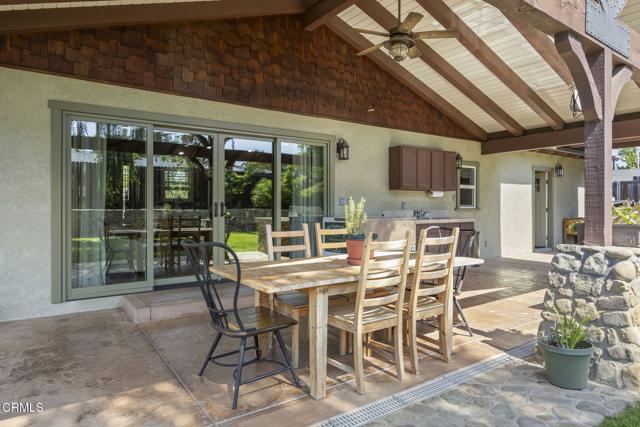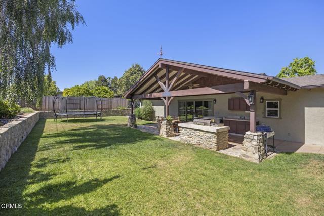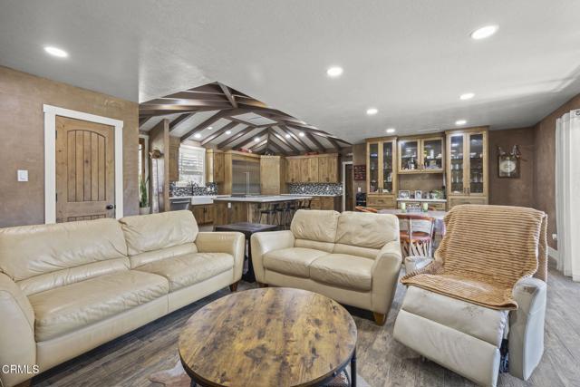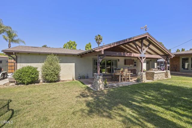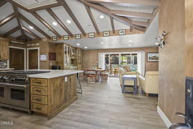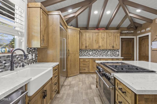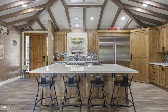 Step into refined craftsmanship and modern sophistication at 920 Larmier Avenue. This exquisitely remodeled 3BD/2BA Oak View home (approx. 1,400 sq. ft.) reflects the meticulous vision of an owner-contractor. Vaulted wood-beam ceilings, Venetian plaster walls, and custom-tiled floors set an elegant tone. The chef's kitchen impresses with quartz countertops, bespoke cabinetry, a Sub-Zero fridge, and Wolf 8-burner range. Custom built-ins and an interior laundry add comfort and style. Sliding doors open to a covered patio with built-in BBQ, sink, and storage--perfect for entertaining. Enjoy a detached office/retreat with deck, gated dog run, and two-car garage plus RV/trailer parking. Lush lawns, olive and avocado trees, and river rock walls frame this private sanctuary. Located on a peaceful dead-end street near schools, shops, and minutes from Ojai, Ventura beaches, and Santa Barbara. A masterfully crafted retreat blending luxury, privacy, and timeless California living. Must see in person to truly appreciate the craftsmanship and quality finishes throughout this home and property.