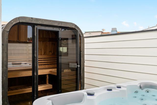 The most private location on Ocean Front Walk! Entertainer's Dream with Expansive Views! This fully remodeled 5-bedroom coastal retreat is the ultimate San Diego beach house. Designed for entertaining, the outdoor spaces feature multiple decks, a spacious patio with Bromic heaters, Sonos speakers, firepit with seating for 10+, a built-in BBQ, and a wellness area complete with hot tub, cold plunge, and sauna. Natural light pours through Fleetwood doors and Marvin windows, framing breathtaking views of Mission Beach, whitewater in Ocean Beach, boats cruising out to sea, and the cliffs of Sunset Cliffs illuminated at night. The main level boasts open-concept living with a custom kitchen featuring quartzite countertops, wood shaker cabinetry, Dacor appliances, wet bar, and seamless indoor-outdoor flow to the deck. Upstairs, the private primary retreat offers dual closets, a spa-like bath with marble finishes, and panoramic ocean vistas. Two additional bedrooms share their own bath with marble countertops and enjoy access to an east-facing deck for sunrise views. Downstairs, a secondary living/game room with wet bar provides additional entertaining space, along with two more bedrooms and a full bathroom. Newly laid pavers surround the property, creating a clean and modern coastal vibe. Parking for 3 cars included. This home is a rare opportunity to own a luxury entertainer's paradise in one of San Diego's most iconic beach communities.