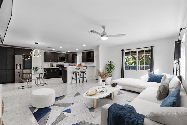Welcome to this stylish contemporary home situated in the heart of Desert Hot Springs. This exquisite 3BR, 2BA residence unfolds over 1,602 sq ft, exuding contemporary elegance and craftsmanship. The home greets you with recently renovated flooring and seamlessly smooth, matte walls, setting a backdrop of understated luxury. The expansive chef's kitchen presents modern counters and sleek cabinets, perfectly complemented by upscale appliances and new light fixtures that provide ambient illumination throughout.The 500 sq ft en-suite is a sanctuary of relaxation, featuring a new mini-split for personalized comfort. A new electrical sub-panel prepares the home for seamless solar integration, reflecting the property's forward-thinking design ethos. Outdoors, the large lot offers serenity and privacy, framed by a sturdy block wall and adorned with custom metal gates that blend art with function.Positioned conveniently close to the post office and shopping, this home harmonizes everyday convenience with refined living. Immerse yourself in this luxurious retreat and experience the pinnacle of desert living. Ideal for those who appreciate meticulous attention to detail, this property redefines contemporary elegance in a vibrant desert setting.
