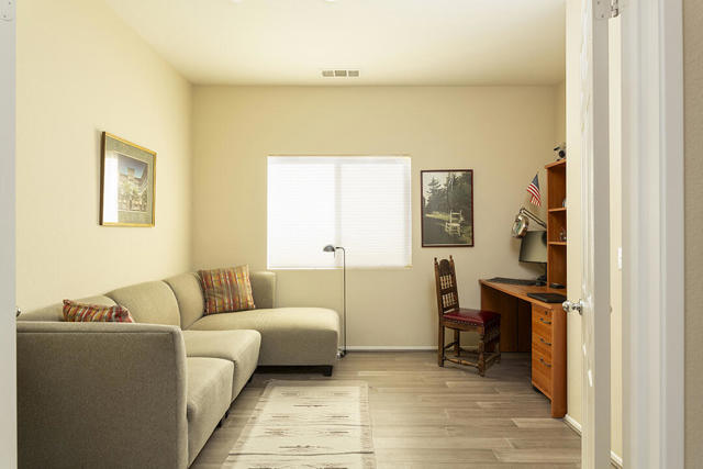Experience the best of desert living in this beautifully updated home in the desirable Mountain Gate community of Palm Springs. This charming 3-bedroom residence has 2 bathrooms and owned solar with a battery backup. It is the ideal choice for anyone seeking a contemporary, move-in-ready property. The light-filled interior features designer tile and rich engineered bamboo flooring.The main area of the home has an open floor plan, with a refreshed gas fireplace in the living room and a media center with indirect lighting installed by California Closets. The kitchen is designed for both style and function with a dine-in prep island, warm wood cabinetry, and granite countertops. The adjacent dining area has large windows and sliding glass doors to the wood-grain-tiled back porch with an Alumiwood pergola. The private backyard includes a recently installed heated spool, artificial turf, and lush landscaping creating an oasis perfect for indoor-outdoor entertaining.The primary suite also accesses this backyard retreat. It includes an en-suite bathroom with an updated shower; there is also ample closet space. A second bedroom, located at the front of the home, offers a versatile library wall with a queen-size Murphy bed--also crafted by California Closets--making it ideal as a guest room or office. The central bedroom with a French-door entry can provide even more flexibility as a media room or workspace. The guest bathroom is off the hall and features an updated tub/shower, a new sink, and a new toilet.Mountain Gate is a tranquil, gated community known for its outstanding amenities, including multiple pools, tennis courts, parks, playgrounds, and access to nearby hiking trails. The CV Link bike and pedestrian path circles the community, offering easy connectivity throughout the Coachella Valley. This Palm Springs home blends comfort, convenience, and resort-style living in one of the area's most sought-after neighborhoods.