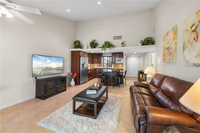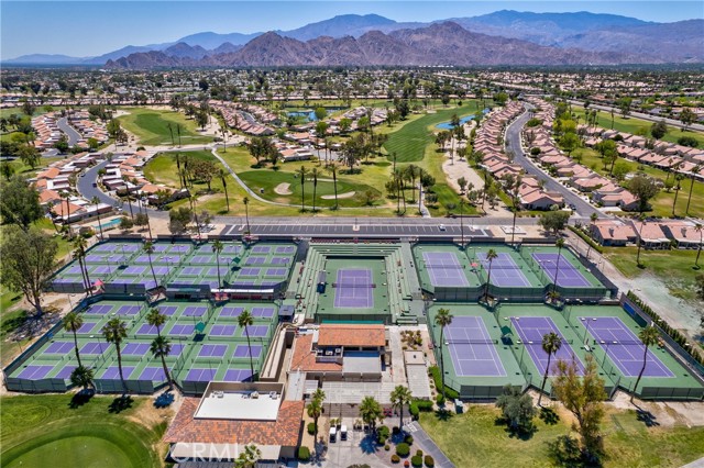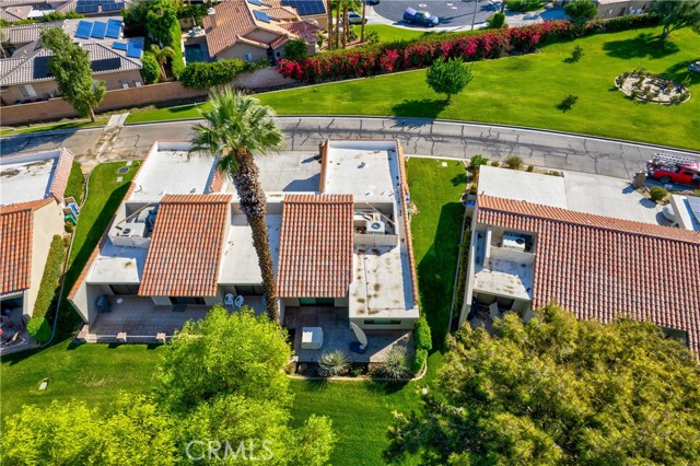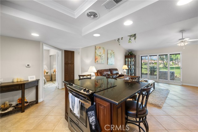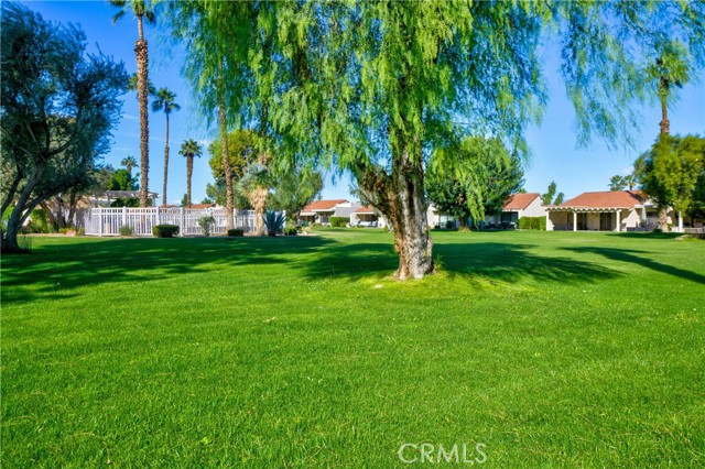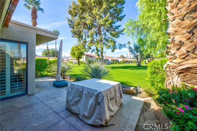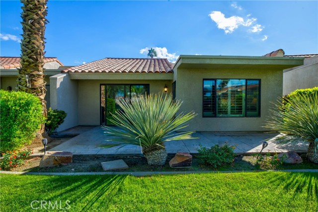 GORGEOUS! upgraded Olympic model located in Palm Desert Resort Country Club, just steps from the pool and spa with relaxing greenbelt and mountain-view surroundings. This beautifully maintained home features an open and bright floor plan with high ceilings, recessed lighting, and large slider that bring in natural light and views of the landscaped grounds. The upgraded kitchen includes granite slab countertops, a spacious center island with cooktop and seating, stainless steel appliances, custom cabinetry with glass inlays, and a warm tile backsplash. The kitchen opens directly to the Great Room, creating a seamless space for dining and entertaining. Tile flooring runs throughout the home with large ceramic tiles laid on the diagonal for a stylish and low-maintenance finish. The split-bedroom floor plan offers excellent privacy. Both bedrooms are spacious with mirrored wardrobe closets. The bathrooms include granite countertops, upgraded fixtures, and tiled walk-in showers. Additional interior features include a newer high-quality water heater and a recently added washer and dryer located in the attached garage. Outdoor living is highlighted by the private back patio with stamped concrete, mature desert landscaping, and wide greenbelt views. A spacious attached garage provides extra storage. Palm Desert Resort C.C. is a guard-gated community offering an 18-hole golf course, lighted tennis and pickleball courts, over 20 pools and spas, and a clubhouse with dining, lounge, and golf shop. The HOA maintains exterior landscaping. This home is ideal for full-time living, seasonal enjoyment, or investment opportunities. Your desert retreat awaits!