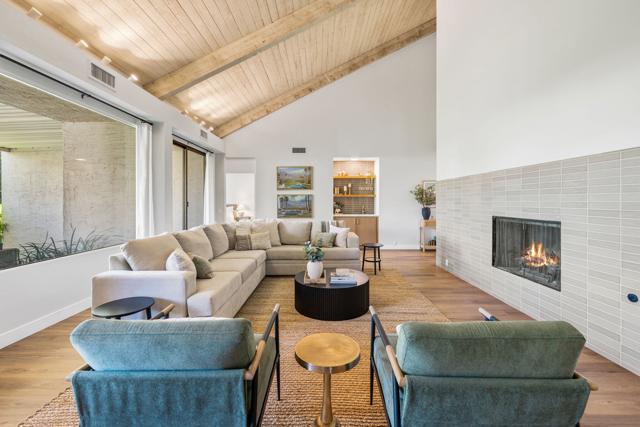 Set behind the guarded gates of Mission Hills Country Club, this beautifully furnished 2-bedroom residence with a newly added office area has been completely transformed by a leading Los Angeles design team. Warm, refined finishes and a seamless indoor-outdoor flow create a space that feels both sophisticated and effortless. The living room immediately makes an impression with its soaring vaulted wood-beamed ceilings, stylish tiled fireplace, and custom built-in wet bar. Large sliders open to a covered patio just steps from the community pool and spa, extending the living space and making everyday relaxation feel natural. The redesigned kitchen is sleek, yet inviting, featuring white oak soft-close cabinetry, brass hardware, stainless steel appliances, quartz countertops, and a spacious island ideal for casual dining or entertaining. The dining area opens to the front patio, where dramatic mountain views set a stunning backdrop. The primary suite serves as your own private retreat with direct access to the back patio. The spa-inspired bathroom features floor-to-ceiling textured tile, dual vanities, and a large walk-in shower. Its reconfigured layout now includes a versatile bonus area off the primary bedroom, which is perfect as a sitting room, office, or reading nook. Guests enjoy their own bedroom with patio access and an updated hall bath showcasing a soaking tub, glazed ceramic tile, and terrazzo-inspired flooring. Additional features include dimmable lighting throughout, a laundry closet, generous storage, and a private two-car garage with dedicated golf cart space. The HOA includes Spectrum cable, internet, landscaping, trash, community pools, and roof and stucco maintenance, and the land lease is secured through 2121. A membership at Mission Hills Country Club provides access to world-class amenities, including three golf courses, tennis and pickleball courts, croquet lawns, fitness facilities, and multiple dining venues. The location is ideal, just minutes from shopping, dining, and hiking; a short drive to the boutiques, galleries, and renowned restaurants of El Paseo; and equally close to the lively energy of downtown Palm Springs with its celebrated eateries, shops, and cultural attractions. Plus, the Palm Springs International Airport is conveniently only 15 minutes away. Offered fully furnished, this move-in-ready home embodies modern desert elegance and the relaxed luxury of Rancho Mirage living.