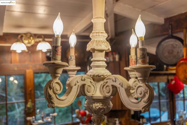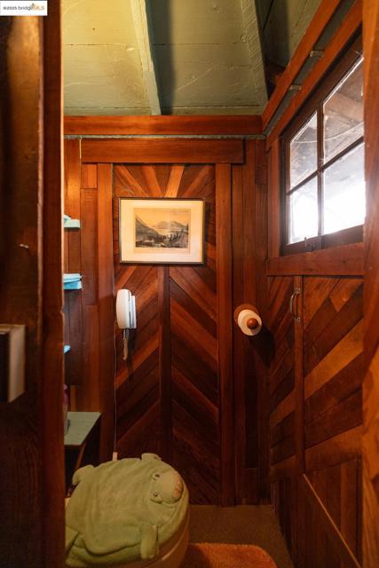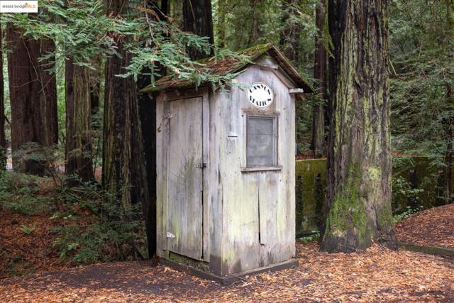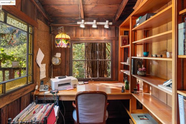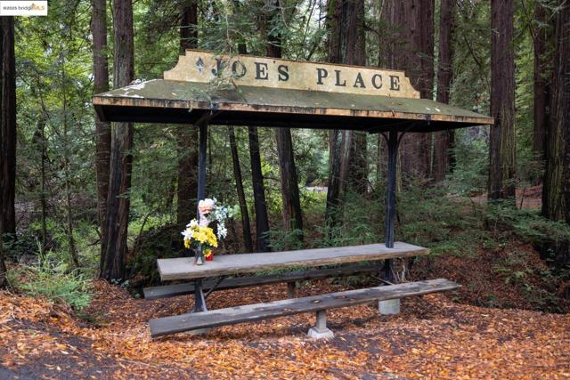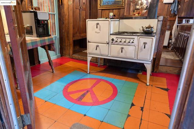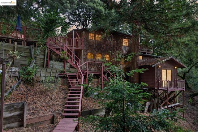 Hidden in the wooded folds between Oakland and Moraga, this former Stationmaster’s home is one of Canyon’s most eclectic retreats, a redwood cabin perched above a ravine where light, air, and creativity converge. Reached by a narrow, illuminated footpath that winds through the trees, the home feels both secluded and alive with its surroundings. Once rumored to host musicians of the psychedelic era, it remains infused with that spirit of originality and calm. Inside, rustic board-and-batten rooms open to forest-view decks. The kitchen’s vintage Wedgewood stove and peace-sign floor recall Canyon’s freewheeling past, while the window-wrapped living room and river-rock fireplace invite reflection and connection. Three bedrooms are linked by ship-style ladders, adding to the home’s character and sense of adventure. Water is drawn from a private spring; electricity and propane service the essentials. The meditation loft above the washhouse (with washer & dryer) provides a quiet refuge for writing, painting, or simply listening to the seasonal creek. Just minutes to Moraga, Oakland, and San Francisco, yet a world apart, with an authentic blend of history, artistry, and nature.
