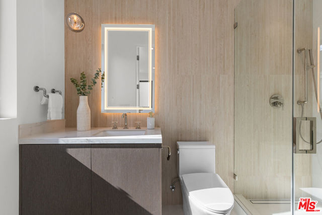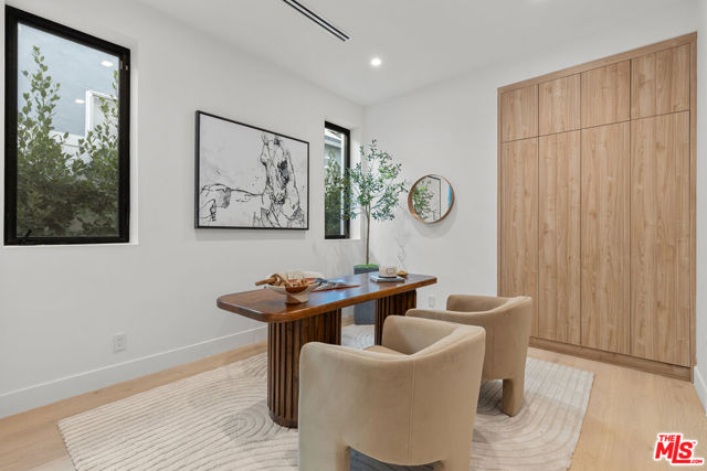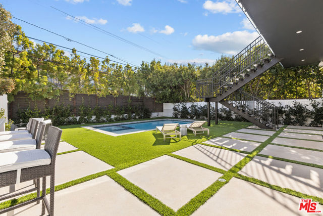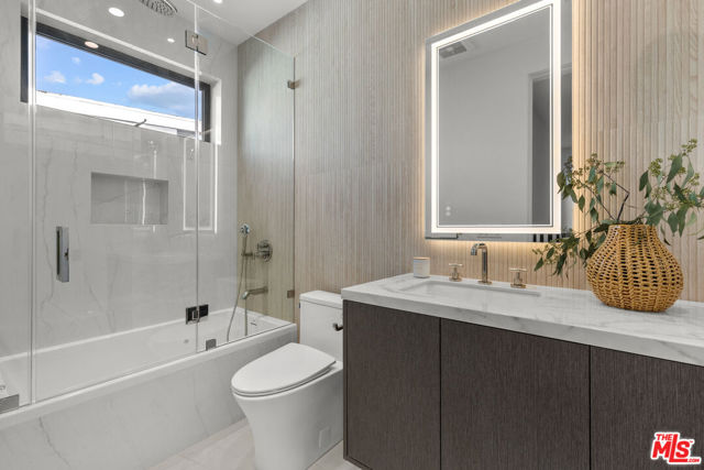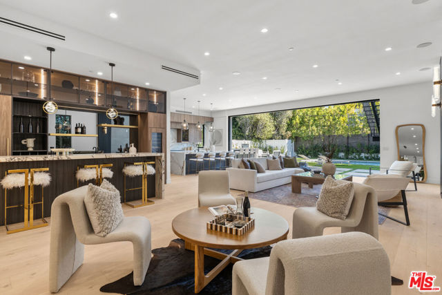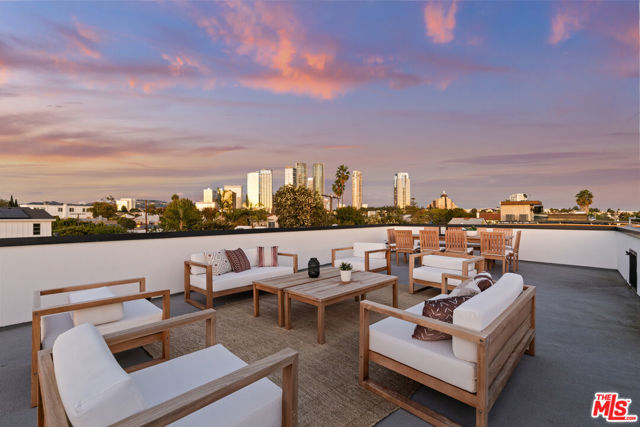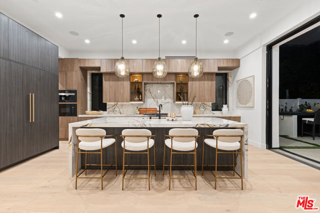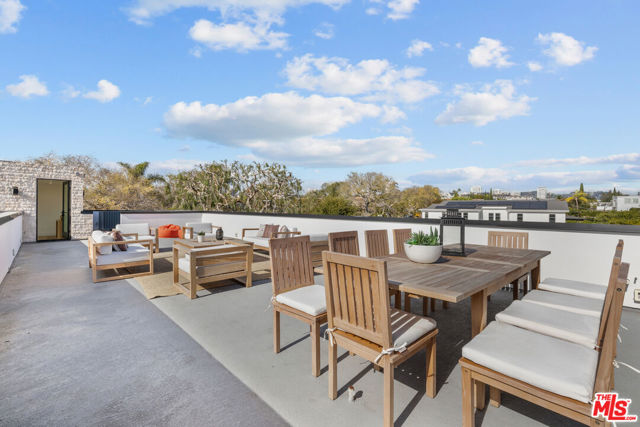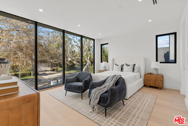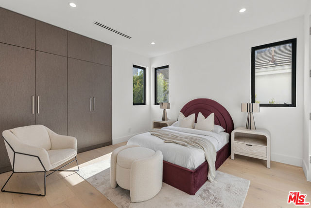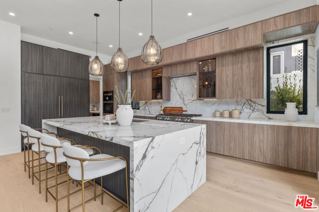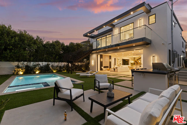 Introducing a brand-new architectural masterpiece that embodies sophistication and cutting-edge design. This 5-bedroom, 5.5-bath residence blends refined craftsmanship with the ultimate in modern convenience each bedroom is en suite, offering private comfort and style throughout. One spacious en suite bedroom is conveniently located downstairs, along with a sleek powder room ideal for guests. The home's main level features open-concept living and dining spaces with seamless indoor-outdoor flow, anchored by wide-plank engineered hardwood floors and an elegant fireplace. The chef's kitchen is outfitted with porcelain countertops and a full suite of Miele appliances including dual ovens, an 8-burner range, built-in coffee maker, wine cooler, and ice maker complemented by a separate pantry with additional storage and appliances. Smart home technology is integrated throughout with Control4 automation, Lutron lighting, Sonos audio in three zones, Nest climate control, a security system with cameras, and fully paid-off solar panels for energy efficiency. Fleetwood doors and windows frame the interiors with natural light and connect to a private backyard retreat featuring a pool and spa with blue porcelain tile detailing, and a custom outdoor kitchen with built-in BBQ, fridge, and prep space. A show stopping rooftop deck crowns the home an entertainer's dream with panoramic city views, pre-installed wiring for outdoor camera/speaker systems and hookups for a gas BBQ and fire pit. Perfectly positioned near Century City, Westwood, and Beverly Hills, this residence offers effortless access to world-class shopping, dining, and entertainment!
