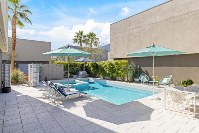 Welcome to this beautiful contemporary home in the highly desired gated community of The Morrison. This lovely three-bedroom, three-bathroom home boasts an open floor plan featuring a spacious great room with a living and dining area, 10 ft. high ceilings and dual, cornered Fleetwood sliding glass doors that open up to the outdoor patio, pool & spa. Other main level features include a bedroom/den with patio/pool access and an adjacent full bathroom, luxurious Porcelanosa tile flooring, a Chef's kitchen with Viking appliances, Caesarstone countertops, Hans Grohe fixtures, new ice-maker, stackable washer/dryer and ample storage space under the stairs. The entire home interior, including the garage, has been freshly painted. The impressive upper-level primary suite showcases lovely mountain views, a walk-in closet, and a spa-like primary bathroom with dual vanities, a large double shower and soaking tub. Rounding out the top floor is a second bedroom with ensuite bathroom and mountain views. Enjoy the spacious, private patio area that is perfect for entertaining, featuring custom pavers, professional landscaping (new lighting & irrigation), a lovely pool and spa, and a built-in gas fire pit. The 2-car garage has epoxy flooring, a newer tankless water heater and water softener & filtration systems. The roof was resurfaced 2 years ago and both A/C units were newly replaced. The Morrison homes are on fee land (you own the land), have low HOA dues, which include building property insurance and earthquake insurance. The community's premier location is close to downtown and all that Palm Springs has to offer. Being sold fully furnished (per inventory list). Don't miss this beautifully appointed home in the gated community of The Morrison in heart of Palm Springs.