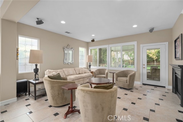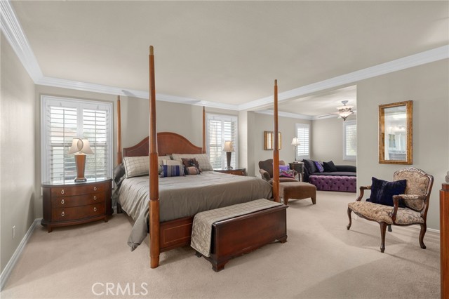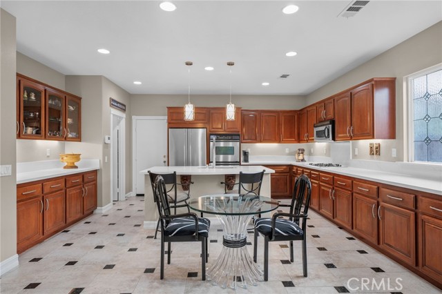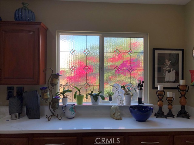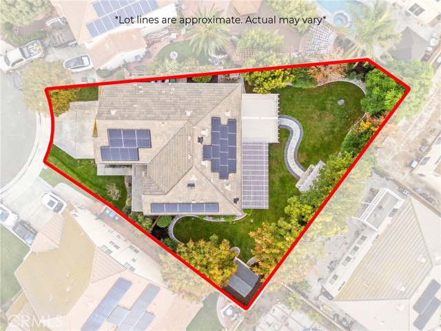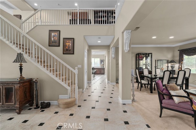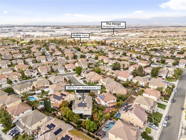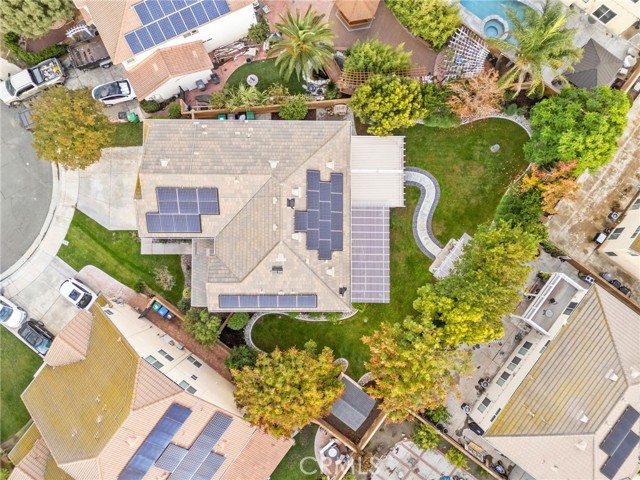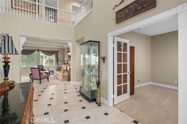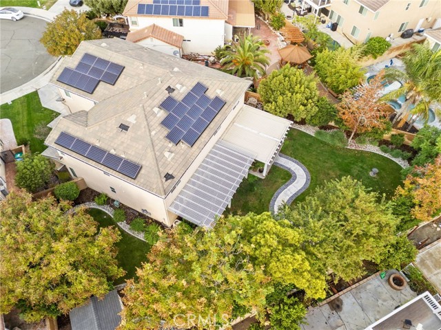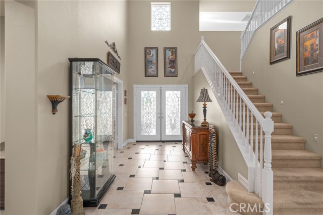 Welcome to this gorgeous Eastvale home, perfectly positioned at the end of a peaceful cul-de-sac and showcasing stunning curb appeal. Beautiful, well-maintained landscaping frames the inviting front porch and custom-designed glass double front doors, created by an artist and featuring a blend of clear, textured, etched, and beveled glass. Additional decorative privacy windows in the family room and primary bathroom echo this elegant style. Inside, you’re welcomed by soaring ceilings, plantation shutters throughout, and beautiful tile flooring. Just off the entry is a double-doored office, highlighted by open railing views from above, adding to the home’s bright and open feel. The layout offers both a formal living room and a formal dining room, perfect for hosting gatherings. The main floor also includes a guest bedroom with its own full bathroom, as well as a convenient powder room. The expansive family room serves as the heart of the home, featuring crown molding, a built-in media niche, a cozy fireplace, built-in surround sound, and direct access to the backyard. Seamlessly connected is the open kitchen, which includes a large center island, abundant cabinetry, a built-in cooktop, and an extra-large walk-in pantry—an impressive highlight rarely found. Custom upgrades and thoughtful storage solutions make this space both functional and inviting. The home also includes PAID OFF solar panels, providing excellent energy efficiency and long-term savings. Upstairs, a charming reading nook leads to an extra-extra large loft—truly a super bonus room. This versatile space is ideal for a game room, media retreat, or additional living area, and features wood-style laminate flooring, also found in the upstairs bathroom. The oversized primary suite includes a spacious retreat area, plantation shutters, and crown molding. The primary bathroom is equally generous, offering dual sinks, a soaking tub, and a separate shower. Three additional bedrooms and another full bathroom complete the upper level. The backyard is beautifully designed with lush grass, thoughtful landscaping, and three patio coverings, providing multiple shaded areas ideal for entertaining, relaxing, or outdoor dining. Additional side yard space adds even more functionality. Located near shopping and top-rated schools, this home is bright, clean, upgraded, and exceptionally spacious—offering comfort, elegance, and luxurious living in one of Eastvale’s most desirable neighborhoods.