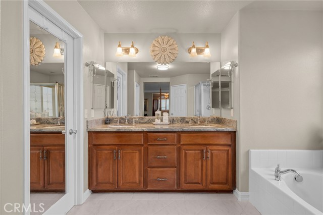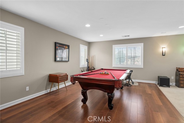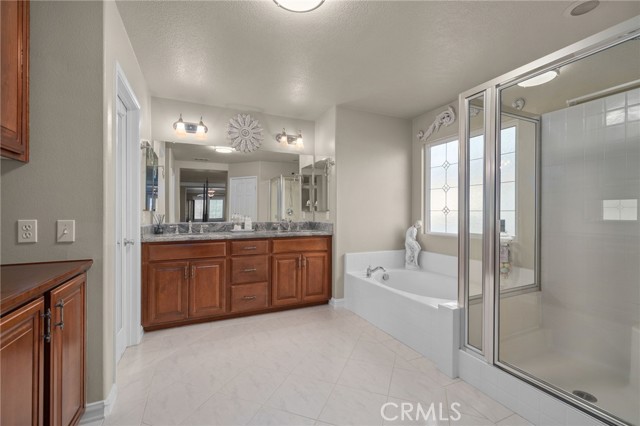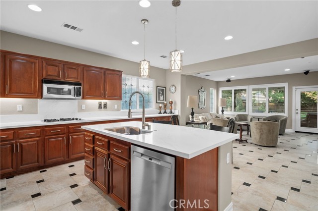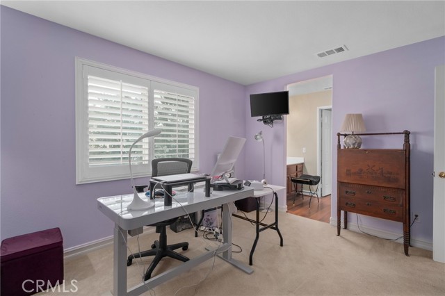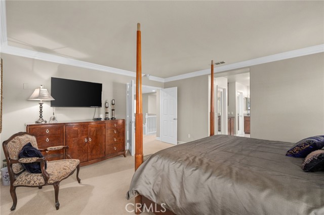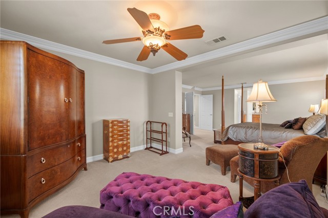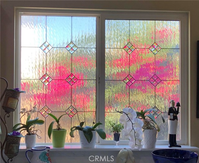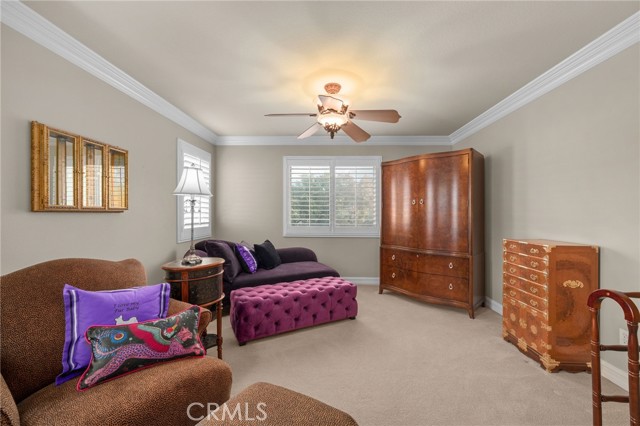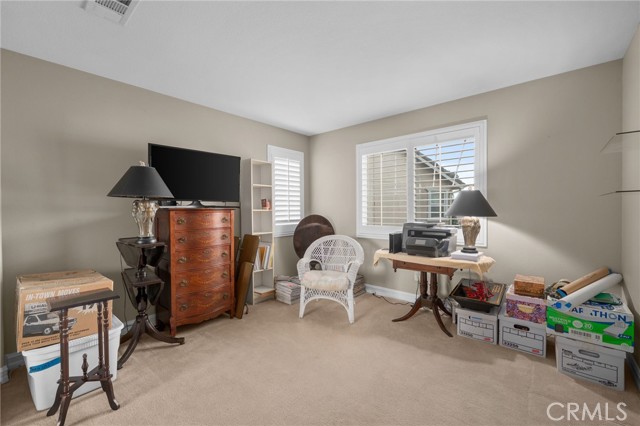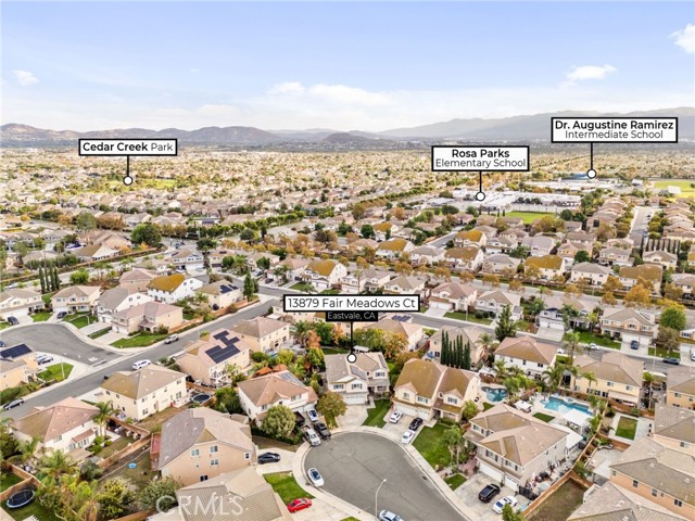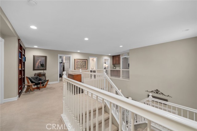 Welcome to this gorgeous Eastvale home, perfectly positioned at the end of a peaceful cul-de-sac and showcasing stunning curb appeal. Beautiful, well-maintained landscaping frames the inviting front porch and custom-designed glass double front doors, created by an artist and featuring a blend of clear, textured, etched, and beveled glass. Additional decorative privacy windows in the family room and primary bathroom echo this elegant style. Inside, you’re welcomed by soaring ceilings, plantation shutters throughout, and beautiful tile flooring. Just off the entry is a double-doored office, highlighted by open railing views from above, adding to the home’s bright and open feel. The layout offers both a formal living room and a formal dining room, perfect for hosting gatherings. The main floor also includes a guest bedroom with its own full bathroom, as well as a convenient powder room. The expansive family room serves as the heart of the home, featuring crown molding, a built-in media niche, a cozy fireplace, built-in surround sound, and direct access to the backyard. Seamlessly connected is the open kitchen, which includes a large center island, abundant cabinetry, a built-in cooktop, and an extra-large walk-in pantry—an impressive highlight rarely found. Custom upgrades and thoughtful storage solutions make this space both functional and inviting. The home also includes PAID OFF solar panels, providing excellent energy efficiency and long-term savings. Upstairs, a charming reading nook leads to an extra-extra large loft—truly a super bonus room. This versatile space is ideal for a game room, media retreat, or additional living area, and features wood-style laminate flooring, also found in the upstairs bathroom. The oversized primary suite includes a spacious retreat area, plantation shutters, and crown molding. The primary bathroom is equally generous, offering dual sinks, a soaking tub, and a separate shower. Three additional bedrooms and another full bathroom complete the upper level. The backyard is beautifully designed with lush grass, thoughtful landscaping, and three patio coverings, providing multiple shaded areas ideal for entertaining, relaxing, or outdoor dining. Additional side yard space adds even more functionality. Located near shopping and top-rated schools, this home is bright, clean, upgraded, and exceptionally spacious—offering comfort, elegance, and luxurious living in one of Eastvale’s most desirable neighborhoods.