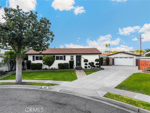 Welcome to 6437 Pheasant Circle, a well-kept 3-bedroom, 1.5-bath single level home set on a spacious 7,743 sq ft lot in a quiet Buena Park cul-de-sac. This 1,243 sq ft residence has been updated with fresh interior and exterior paint, new carpet, new ceiling fans and remodeled full bathroom featuring a new bathtub, tile flooring, vanity, and fixtures. The kitchen has refreshed cabinetry with a clean, modern coat of paint. An extra-long driveway provides RV parking and leads to a 2-car garage with a convenient drive-through design, offering added flexibility for parking, storage or backyard access. The garage is equipped with 220-volt wiring, making it EV-charging ready. The backyard includes a covered patio, storage shed and attractive landscaping, creating a comfortable space for everyday outdoor living. With its generous lot size, the property offers excellent potential for expansion, including adding an ADU and converting the detached garage into a Junior ADU, creating a fantastic opportunity for additional income. Excellent neighborhood with a home that’s move-in ready and conveniently located close to Knotts Berry Farm, Buena Park Mall and the 91 Freeway.