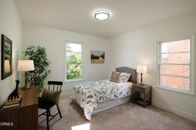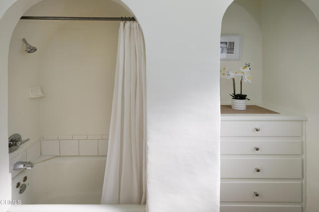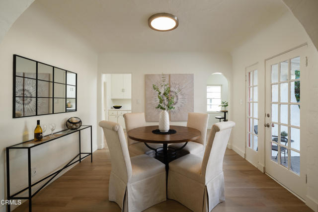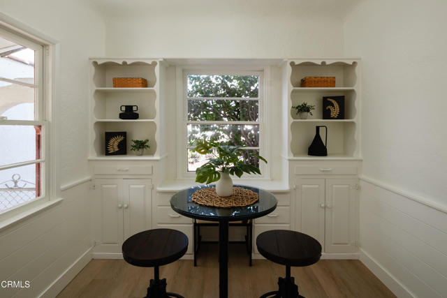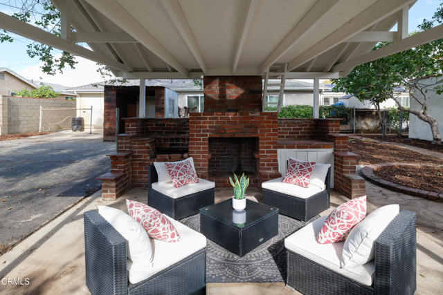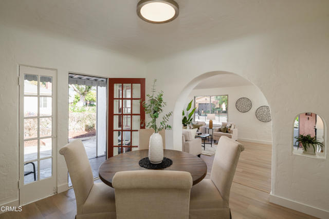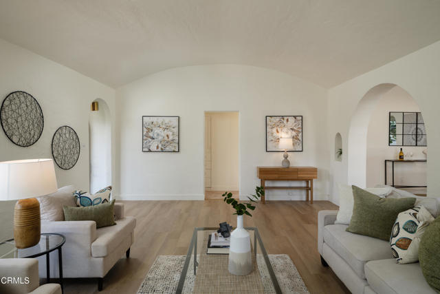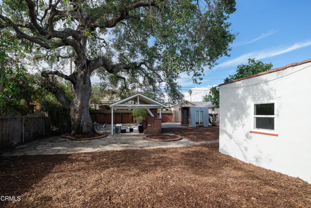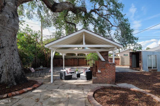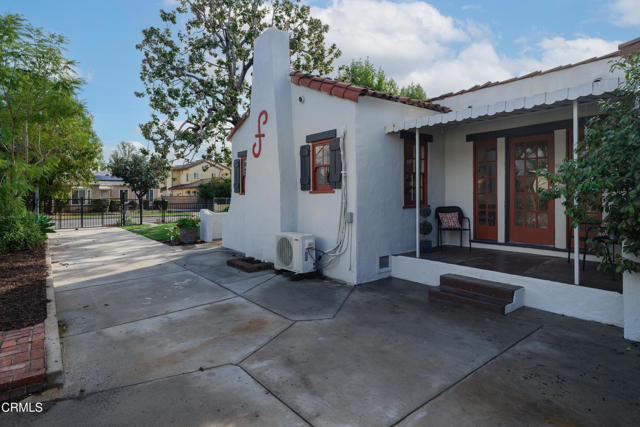 Nestled within a lovely Temple City neighborhood, this enchanting Spanish-style home blends timeless architecture with thoughtful updates. Behind a gated front yard framed by a graceful magnolia tree, a distinctive turret entry welcomes you through a custom rounded front door, setting the tone for the character and warmth found throughout. Inside, the living room showcases a dramatic barrel ceiling, built-in shelving surrounding the classic fireplace, and a ductless mini-split air conditioning system for year-round comfort. Double-hung windows invite soft natural light, highlighting the craftsmanship and charm that define this era. A graceful arched doorway leads to the formal dining area, ideal for gatherings, and continues into the kitchen, where modern touches meet classic design. Quartz countertops, LED lighting, and ample cabinetry provide both style and function. Off the kitchen is a cozy breakfast nook with built-in cabinets and an arched pass-through to the dining room, a perfect spot for morning coffee. Nearby, a utility and laundry room offers additional storage and backyard access. The home's two bedrooms each feature closets with the hallmark vintage windows so characteristic of early California homes. Between them sits a full bathroom with a tub and shower combination, a single-sink vanity with stone countertops, and period-inspired details that honor the home's heritage. Outside, the expansive backyard invites both relaxation and entertaining. A covered patio and outdoor fireplace create a welcoming space for gatherings beneath the shade of a majestic oak tree. The gated driveway and side porch add convenience and charm to this picture-perfect property. The detached garage has additional storage and a workbench area. Located just moments from the San Gabriel Country Club, local dining, and entertainment, this Spanish gem offers a rare opportunity to own a piece of Temple City character and history, where timeless architecture meets everyday comfort.
