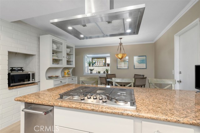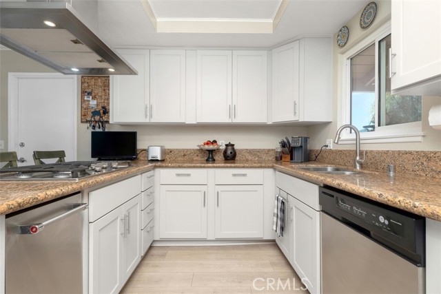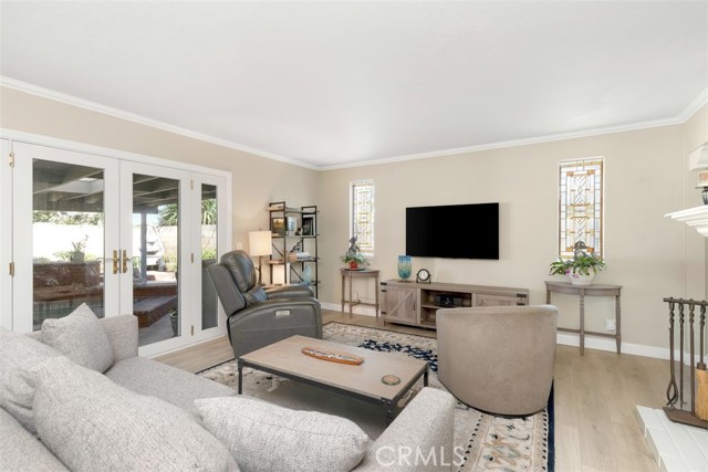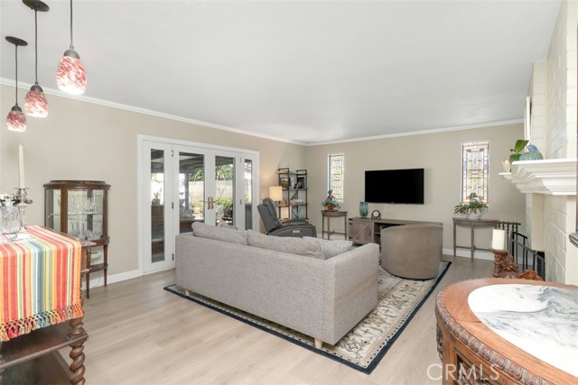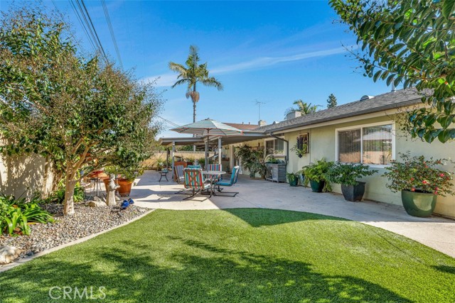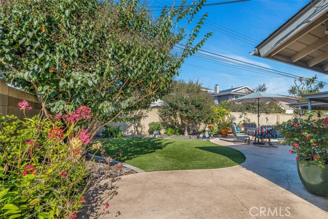 Prestigious beach home, situated on an over sized interior corner lot, while offering excellent curb appeal. It all begins with a renovated front yard, featuring a pavers driveway plus drought resistant landscaping with a fountain, a wooden deck and a picturesque mature tree. A new vinyl fence is also in the process of being installed shortly. As you approach the entry, you are welcomed by a Flagstone front porch and a custom front door with a pocket screen. Once inside, you are greeted by a spacious formal living room, featuring a gas or wood burning fireplace, stained glass windows and French doors leading to the rear patio. The kitchen has been updated in stages with granite counters, recessed lighting, updated cabinets installed in 2014 plus 5 year old stainless steel appliances, with the refrigerator and microwave included in the sale. There is a full sized dining room adjacent to the kitchen, showcasing a large garden window. The hall bathroom has been updated with a bathtub/shower with an acrylic surround plus glass enclosure, vanity with quartz counter and travertine flooring. All of the bedrooms are nice sized and there are mirrored wardrobe closets in the primary plus 2nd bedroom. The primary bathroom offers an acrylic lined shower, vanity with quartz counter plus a travertine tile floor. There are tons of bonus features including: crown moldings, textured ceilings, newer laminate flooring, dual pane windows, a brand new water heater, newer heating, air conditioning, ducting and insulation, all installed in 2021, copper plumbing, a roll-up garage door with a quiet opener and a 30 year roof with rain gutters, installed 11 years ago. Saving the best for last, the private rear yard features a heated in ground spa with an elegant brick surround, a large covered patio area with skylights, a natural gas built-in stainless steel BBQ, a large wrap around patio with a built-in gas firepit, French drains, artificial turf, nice landscaping and a garden shed. This lovely home is also walking distance to award winning schools, a park, golf, shopping, restaurants and is less than a 5 minute drive to the beach or the Bella Terra Mall!