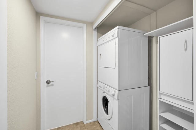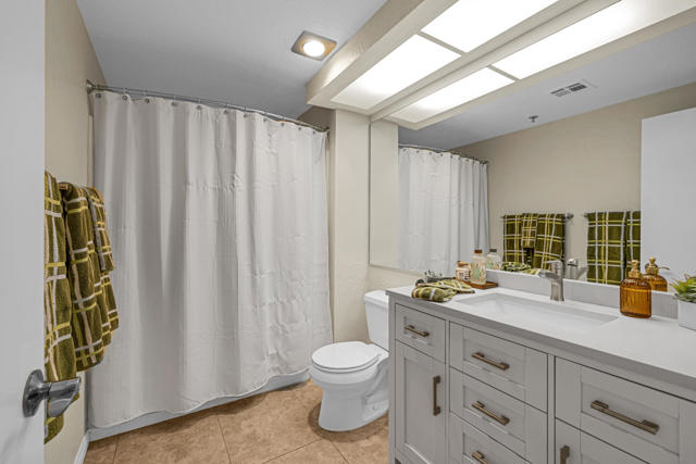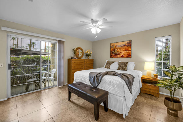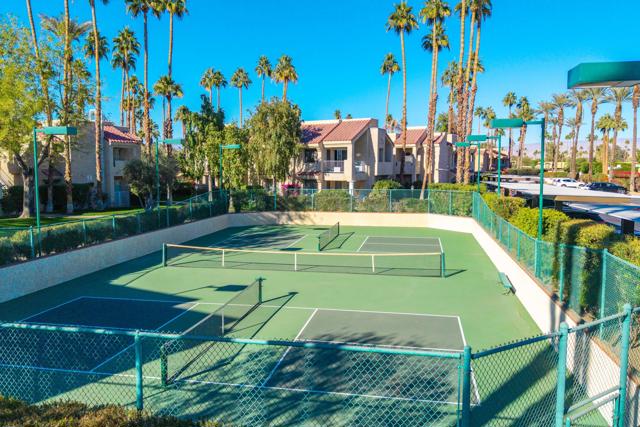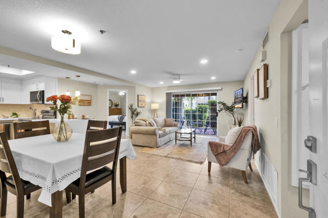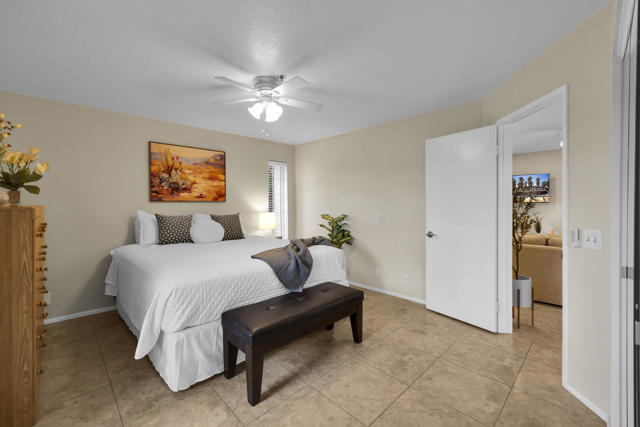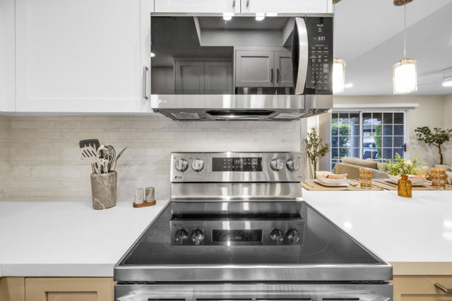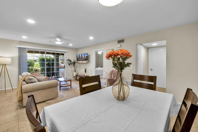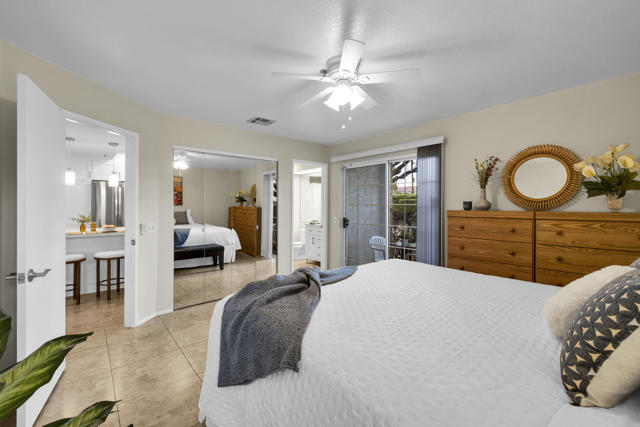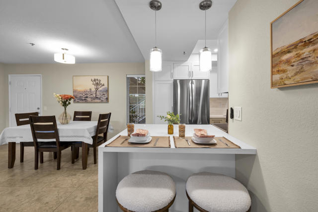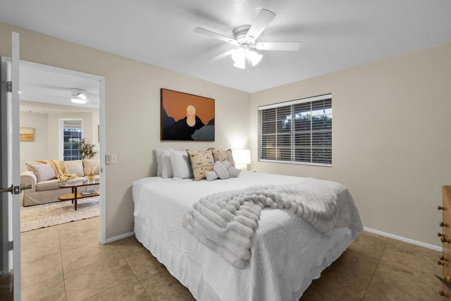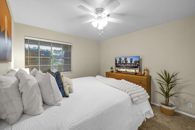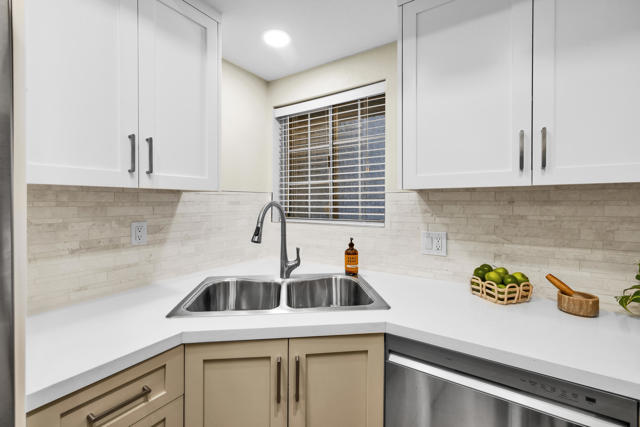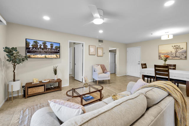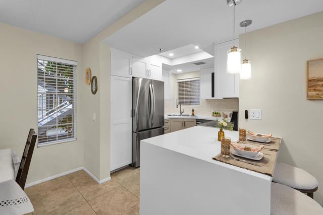 Located in highly desirable south Palm Springs--away from airport traffic and wind--this freshly remodeled two-bedroom, two-bath condo sits in the charming, snowbird-friendly community of Esprit. Recently painted in a soothing palette of light beige and white, the home features updated recessed LED lighting with dimmers, a sleek new living-room ceiling fan, and a timeless dining fixture.The custom two-toned fully redone kitchen is both stylish and functional, offering soft-close shaker cabinets with pullouts, brand-new never-used LG ThinQ stainless appliances, white quartz counters with silver specks, an expanded waterfall-edge breakfast bar, and a marble backsplash.The open floor plan maximizes space, with two well-sized ensuite bedrooms. The primary bathroom includes a new vanity with quartz counters and plenty of storage while the guest bathroom has dual sinks, updated faucets, new shower head and glass shower door. Throughout the home, new white horizontal and vertical blinds add a clean, modern touch.Enjoy two patios--one off the living room and another off the primary bedroom. The neutral beige tile flooring runs seamlessly throughout the unit. Tucked quietly at the back of the community, this ground-level corner end unit offers exceptional privacy with no shared walls.Sold partially furnished with a well-stocked kitchen, this move-in-ready home makes it easy to settle in and start enjoying everything Esprit and Palm Springs have to offer.