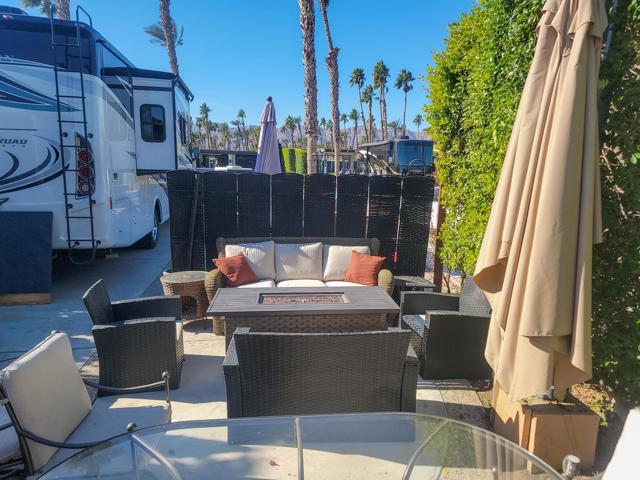 Outdoor Resort Indio is a class A only RV resort and this is an RV lot.Enjoy privacy, comfort, and resort convenience with this beautifully landscaped lot located just a short walk from the satellite pool, hot tub, sauna, and laundry. The inviting medium-sized outdoor kitchen features a round bar with umbrella and four chairs, built-in gas burner and large BBQ, oven, dishwasher, refrigerator, sink, and storage, all enhanced by ample lighting and hot water for effortless entertaining.Multiple seating areas include a dining table with umbrella, an outdoor fire table flanked by two sofas, and additional chairs and side tables--perfect for gathering with friends. This is a private and well-designed lot offering a true resort lifestyle.