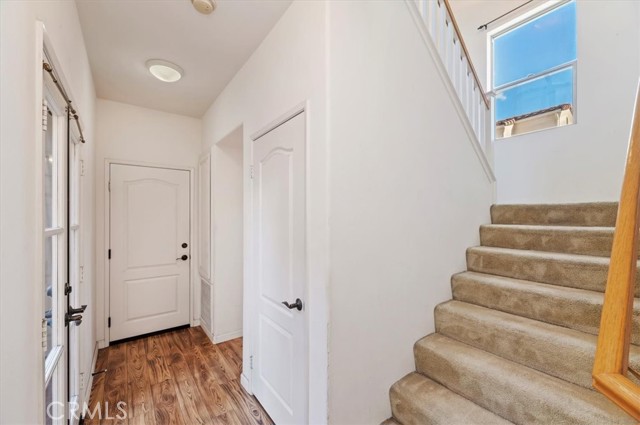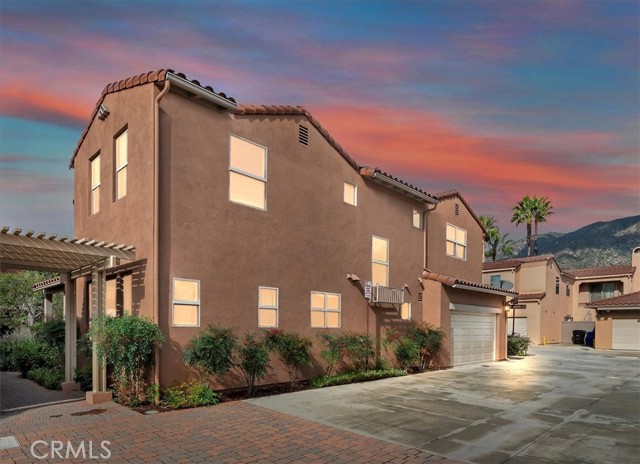 Get into your New Home by Christmas or New Years! Deduct some of your RE expenses this year on your tax returns, if you do! This home is ready to go. Lovely Town Home in Duarte Trails. 3 bedrooms, 2.5 baths, approx 1653 sqft. End unit. Lovely Court yard in front of this home with Olive tree and paver stone walk way around. Incredible wood front door invites you into this open floor plan home with lots of windows for natural light and newer wood laminate flooring. Dining room is spacious with beautiful iron chandelier. Kitchen offers lots of counter space and breakfast bar too. Both are adjacent to the family room with a cozy fireplace and a ceiling fan for those warmer days. Down the hall you will find a significant closet with storage under the stairs. A Half bath and direct access to a 2 car garage. French doors w/sliding screen doors allows you to go directly out to your private patio with pavers, enjoy the mountain view as you BBQ or entertain. Upstairs you will find a large primary bedroom with walk in closet, a primary bathroom with a dual vanity, separate tub and walk in shower. Next you will find a Laundry area with bi-fold doors, 2 good size bedrooms, one with a balcony and San Gabriel mountain view, and a dual vanity guest full bath. Quiet neighbor hood, close to lots of shopping and restaurants. Guest parking right next to your garage. Make an appt today to make your dream come true by owning your very own home just in time for the holidays!