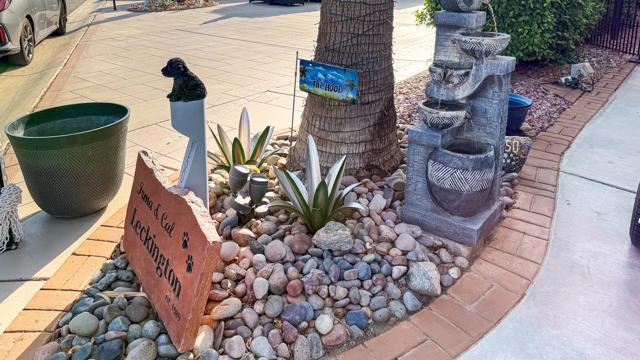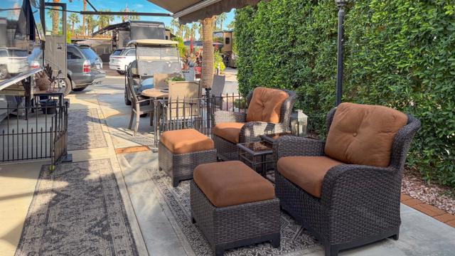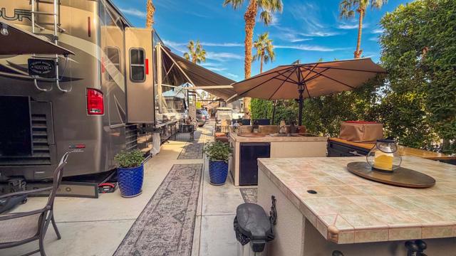 Outdoor Resort Indio is a Class A Motorcoach resort. This is an RV lot. This inviting, private RV lot features a nice outdoor kitchen with tile countertops, an induction cooktop, refrigerator, hot water, garbage disposal, and impressive storage--perfect for cooking and entertaining. The lot includes convenient mid-lot hookups for added flexibility.Enjoy relaxed outdoor living under the charming gazebo with a ceiling fan, complemented by two large umbrellas that expand your shaded space, along with a tranquil water feature that enhances the atmosphere. Furnishings are negotiable, offering flexibility for your personal style and needs. The rear of the lot offers generous living space, quiet surroundings, and excellent protection from afternoon sun and wind.