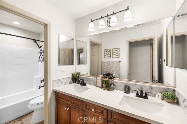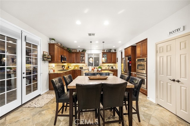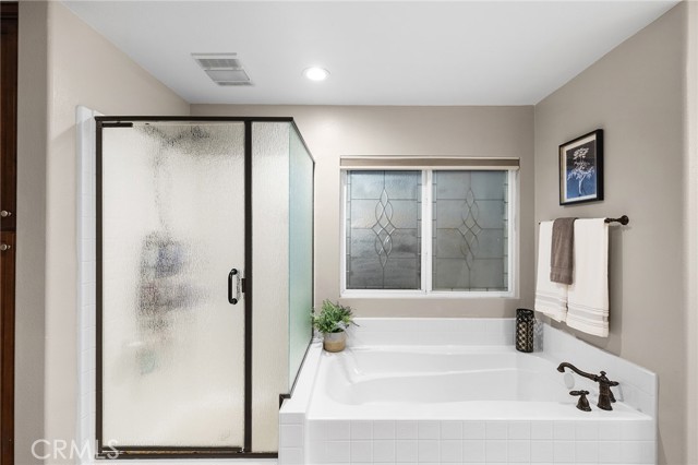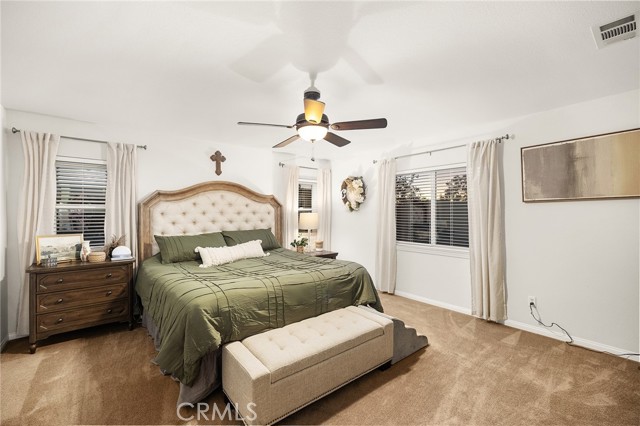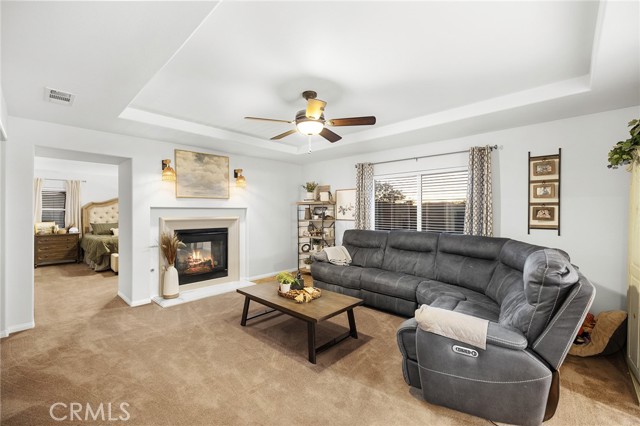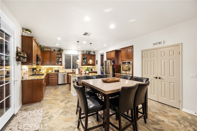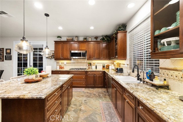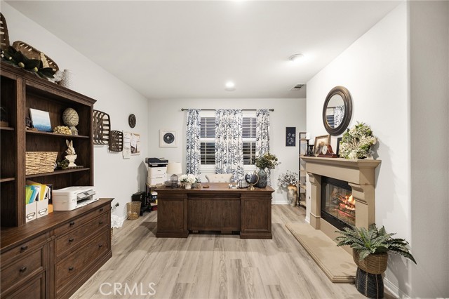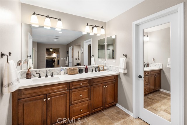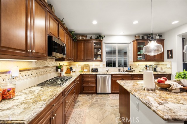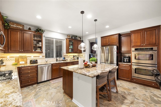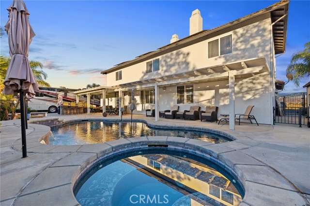 This is the unicorn property you've been waiting for – a spectacular move-in ready 5-bedroom, 4-bathroom pool and spa estate with RV parking on a generous nearly 11,000 square foot lot with NO HOA! Sprawling across nearly 4,000 square feet of luxurious living space, this exceptional home features a highly versatile floor plan perfect for comfortable multigenerational living with one oversized bedroom and full bathroom downstairs, plus a den/office that could easily be converted to a 6th bedroom. Freshly painted inside and out, enter through a grand foyer with soaring vaulted ceilings flanked by an elegant formal dining room and a stunning formal living room with cozy fireplace, currently being used as an office. The gourmet kitchen showcases beautiful rich wood cabinetry, convenient double ovens, gas cooktop, an oversized island with gorgeous decorative backsplash, functional butler's pantry with mini fridge and sink, plus a nice-sized pantry, all overlooking the expansive family room featuring a recently remodeled designer fireplace. A dramatic sweeping staircase with striking wrought iron balusters leads to three additional generously sized bedrooms upstairs, one of which is an ensuite with full bathroom, plus another full bathroom and the magnificent primary suite. The luxurious primary suite boasts a huge attached flex/sitting room with convenient wet bar and mini fridge, complemented by a stunning dual-sided fireplace shared between the serene bedroom and versatile sitting area. The spa-like primary bath offers a spacious separate shower, relaxing soaking tub, elegant dual vanities, and his-and-her walk-in closets. The entertainer's dream backyard provides complete privacy and features a sparkling inviting pool and spa, durable aluminum wood patio cover, built-in BBQ area, ambient firepit, and spacious storage shed. The front and backyard showcase beautiful drought-resistant artificial turf that saves significantly on water bills while maintaining pristine curb appeal year-round. Additional impressive highlights include RV parking with hookups, generous toy parking, energy-efficient solar system, whole-house water softener, elegant plantation shutters throughout the main level, and abundant storage throughout. Perfectly positioned with convenient access to freeways, shopping, schools, and parks, this one-of-a-kind sanctuary offers the ideal blend of luxury, functionality, and location!