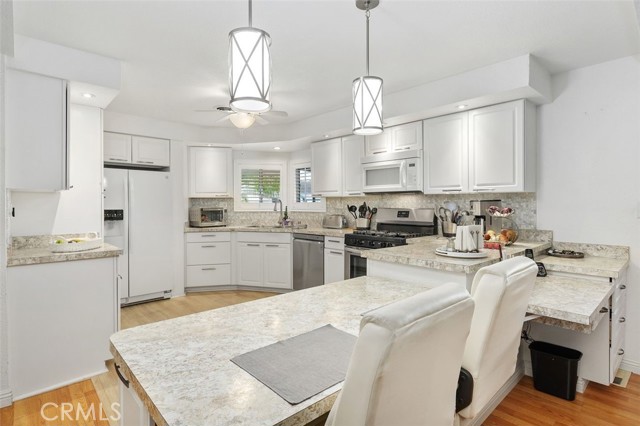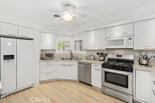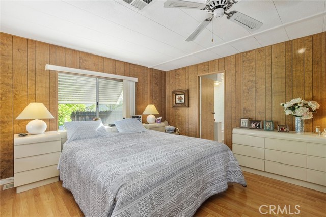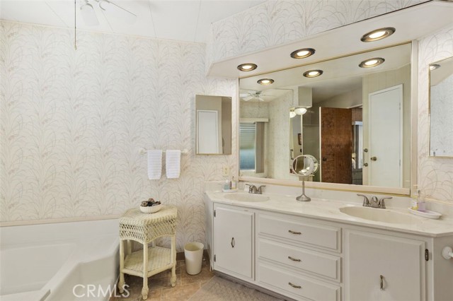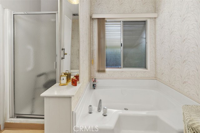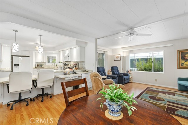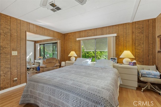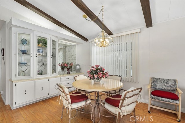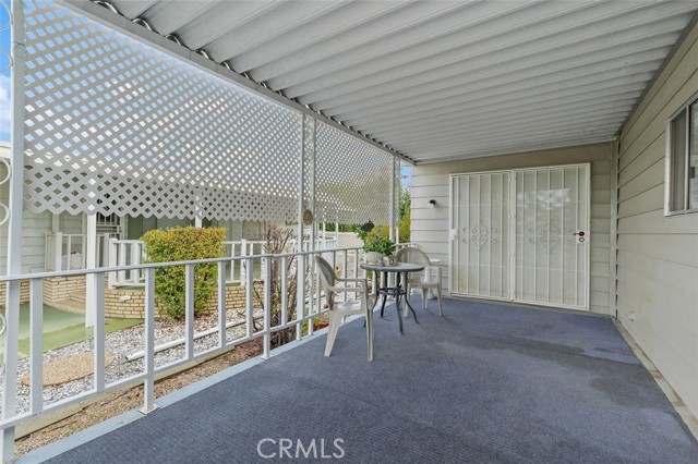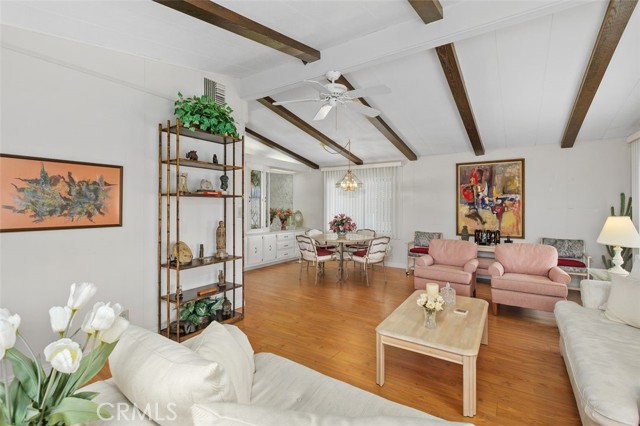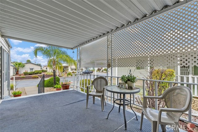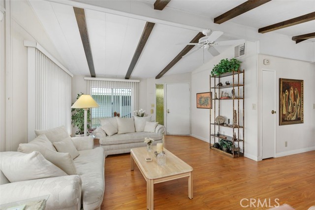 55+ Living in the heart of Murrieta, Golf Knolls community with lots of ammenities! This two-bedroom, two-bathroom home offers an approximately 1,680 square foot spacious layout. The home has been well cared for inside and out. Meticulous minimal maintenance Landscape, inviting patio and 2 sheds for extra storage. A covered patio and ample parking space offer convenient amenities and creates an overall serene and inviting outdoor environment. Stepping inside, the home is filled with abundant natural light, highlighting the stunning hardwood "look" Laminate flooring throughout. Vaulted ceilings and exposed beams create an airy, open feel. The Kitchen was completely remodeled and includes modern appliances and neutral color palette providing a clean, contemporary look. The primary bedroom is spacious, offering ample storage both with a walk in closet, a separate office/library space and a well appointed, spacious bathroom with ample vanity space, walk in shower and deep inviting tub. The second bedroom is also generously sized, complementing the overall design and layout of the home. The layout is well-designed, offering a seamless integration of indoor and outdoor living spaces, ideal for those seeking a comfortable and versatile living environment. Golf Knolls is a wonderful, well kept community offering many amenities and activities for those who wish to join in.