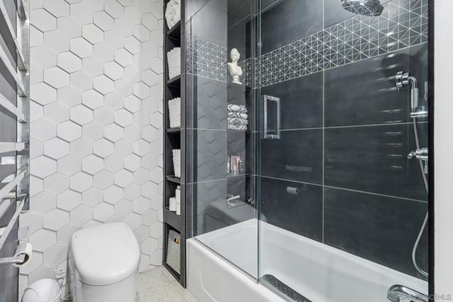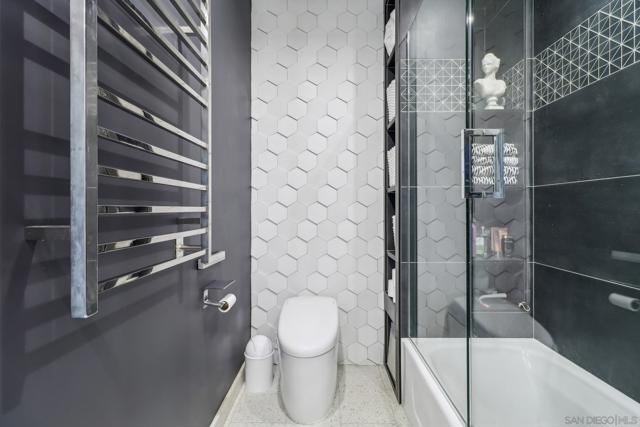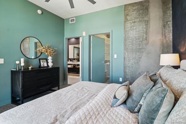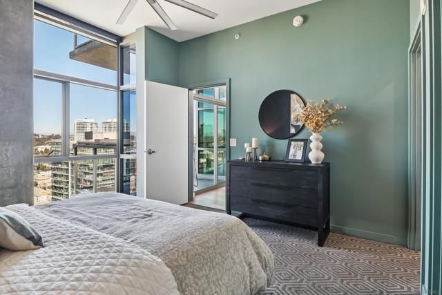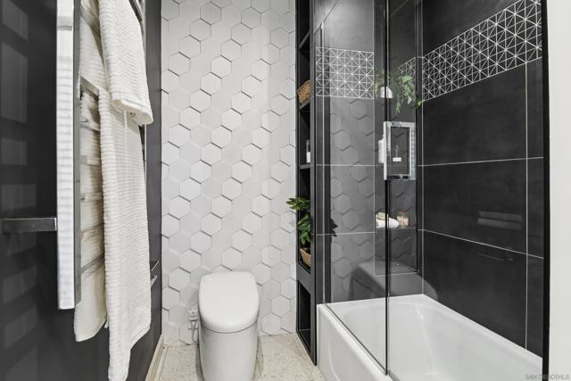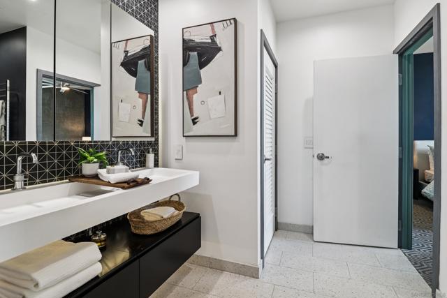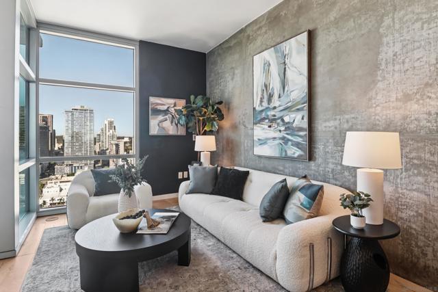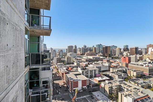This stunning contemporary residence boasts a FULL luxury remodeled, located on the 27th floor, highest floor for a one bedroom, and enjoys WATER VIEWS, TWO PARKING SPACES (non tandem) and storage. Unparalleled living experience breathtaking water / city views, expansive windows that flood the space with natural light. Fully remodeled gourmet kitchen - Sub-Zero and Miele appliances (induction cooktop, wine fridge, coffee maker). Ultra lux PEDINI cabinets. Gorgeous bathroom, hardwood floors, and more. Welcome to urban sophistication at the finest condo in the heart of downtown San Diego. This stunning contemporary residence in the East Village offers an unparalleled living experience with breathtaking city views from your private outdoor patio and expansive windows that flood the space with natural light. This modern one-bedroom on the 27th floor is the highest floor for a one-bedroom at The Mark. The gourmet kitchen is equipped with a Sub-Zero refrigerator and Miele appliances: a Miele coffee maker, a Miele steam oven, a Miele Induction cooktop, and a Miele Dishwasher. Included in the kitchen is a full-size Sub-Zero wine storage. An amazing exhaust plus lighting unit over the cooktop is a must-see. The kitchen cabinets are by PEDINI, the pinnacle of Italian kitchen design, with quartz countertops. There are oak wood floors throughout the living room and kitchen. Redesigned Porcelanosa bathroom with a real Terrazzo floor, Robern Medicine cabinets, and Elegant Brizo Litze bathroom fixtures, TOTO Neorest toilet, Amba towel warmer, and Electrolux washer/dyer. The bedroom includes a nice-sized walk-in closet. The unit includes two assigned parking spots and a nice-sized storage unit. Take a dip in The Mark's full-size pool, state-of-the-art gym, and outdoor cooking with pizza oven. 24-hour concierge service. Kitchen: Pedini custom cabinets from Italy Quartz countertoops Undermount lighting Sub Zero: Refrigerator/freezer Wine refrigerator holds 59 bottles Miele: Induction cooktop Dishwasher steam oven Coffee/espresso maker White Oak wood floors, wide and long planks Updated lighting Bathroom: Porelanosa sink, cabinets, and 3-dimensional tiles as accent wall Toto Toilette with built-in bidet 3 Robern medicine cabinets Terrazzo floor Unmount lighting on sink and cabinets Lighting around/behind medicine cabinets Towel warmer Brizo Litze Fixtures Electrolux washer and dryer Bedroom: Custom walk-in closet Oversized Storage Unit next to parking spots 2 Assigned/designated Parking spots Oversized Storage Unit next to parking spots