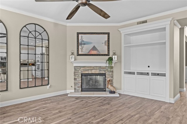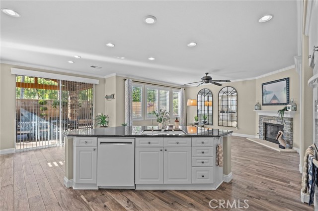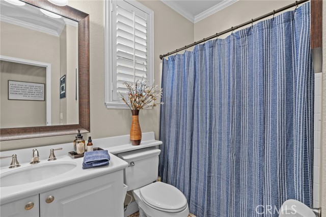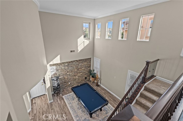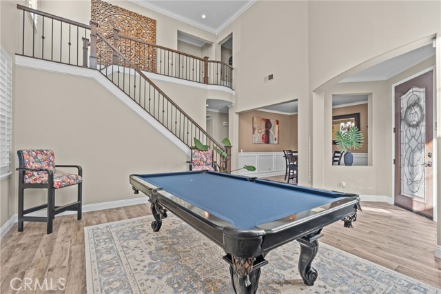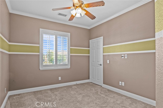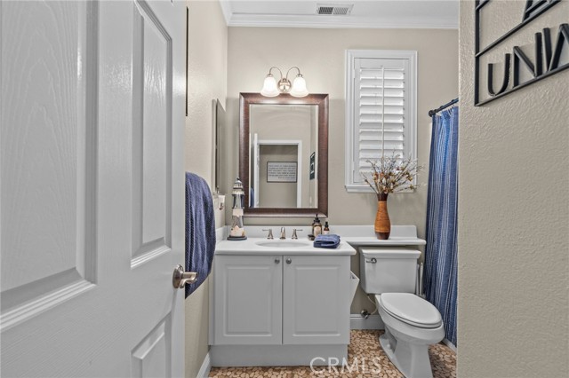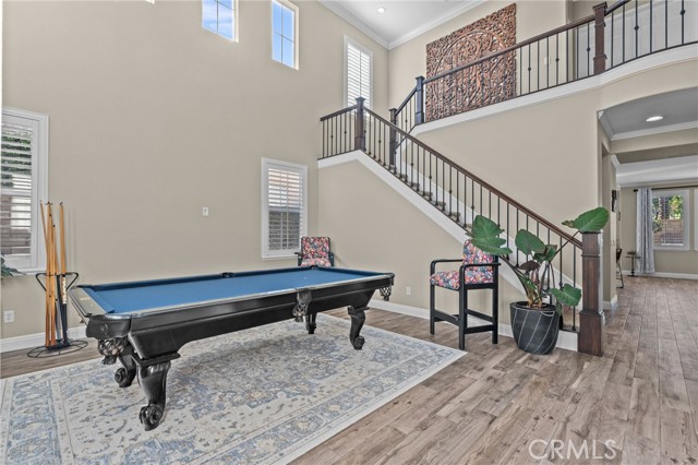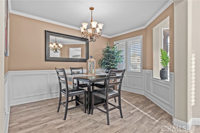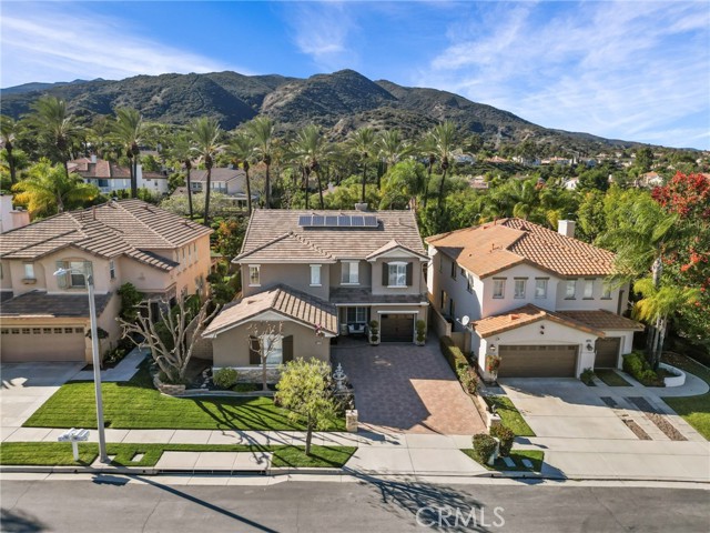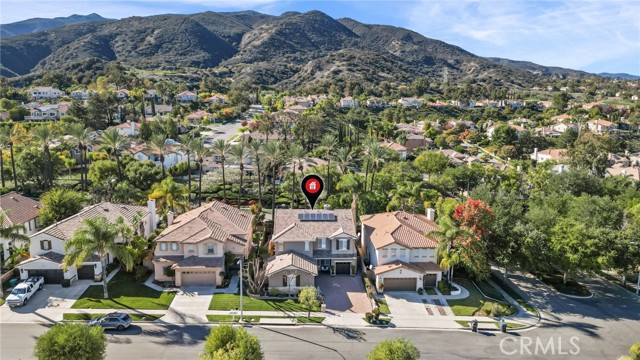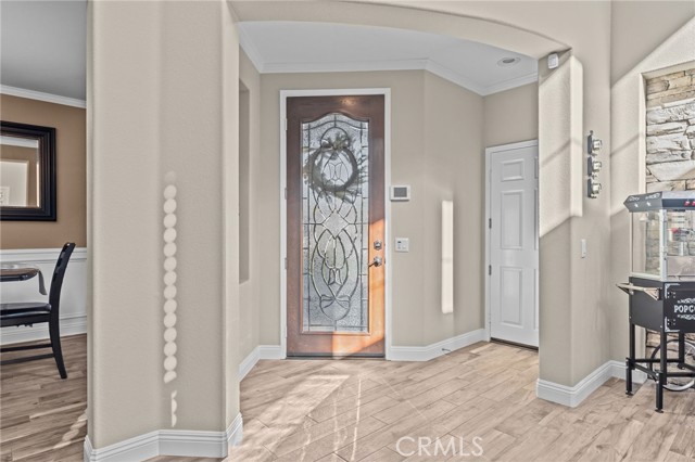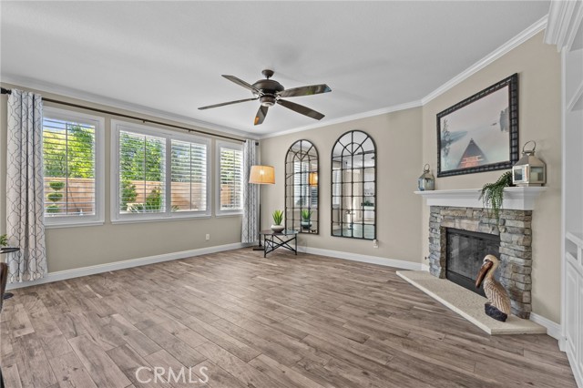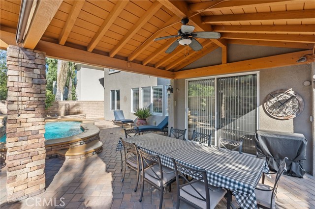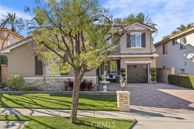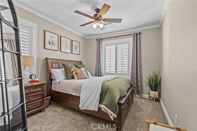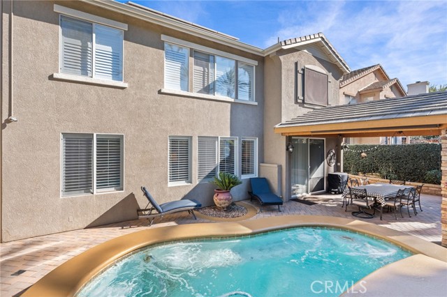 Elegant home in the prestigious Eagle Glen Community! This beautifully upgraded residence features a stunning front door, soaring high ceiling, and a spacious, open floor plan. Offering 5 bedrooms and 3 bathrooms, including a convenient main-floor bedroom and full bath, this home is perfect for comfort and flexibility. The primary suite includes an oversized shower and generous walk in closet. Additional highlights include wood-like tile flooring, iron stair railings, a cozy family-room fireplace, and a well appointed kitchen with a cooktop range, walk-in pantry, center island, and abundant cabinetry. Throughout the home you'll find crown molding, window shutters, upgraded baseboards, and ceiling fans. Vacation in your own resort-style backyard featuring a covered patio with ceiling fan, a cozy fire pit, a relaxing swim spa, and glamorous hardscape. Other features include a 3-car non-tandem garage, attractive driveway, two AC condensers, Ecobee thermostat, security cameras, and lower property taxes with NO CFD. The backyard is enclosed with block walls, offering durability, low maintenance, and enhanced privacy. Conveniently located near schools, shopping, and the freeway. Com and see - This is perfect place to call home!