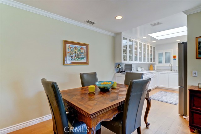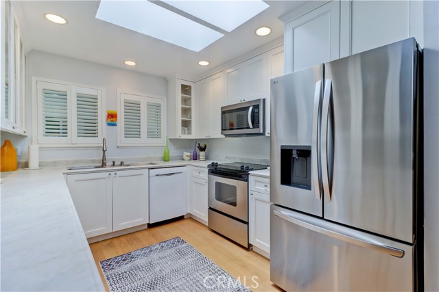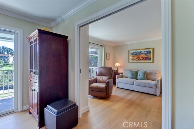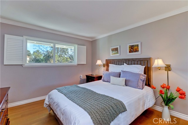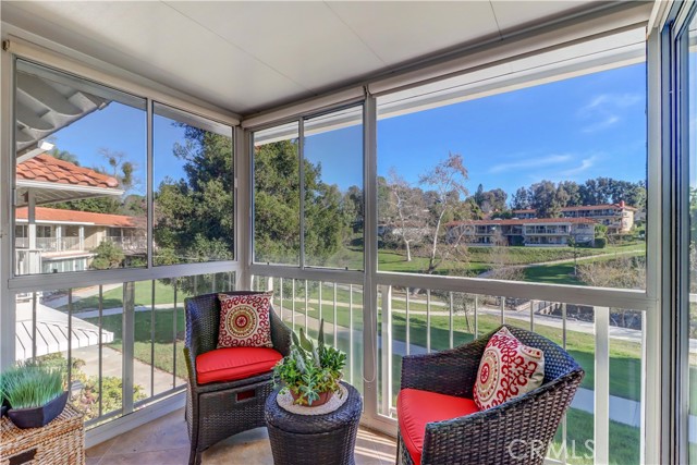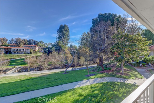 This is the home you’ve been waiting for and so rarely available! Enjoy a beautiful southeastern view overlooking Aliso Creek Nature Preserve, the charming walking bridge, and lush greenbelts from this ideally located “Casa Linda” co-op. Best of all, there are no steps from the carport to the front door, making everyday living easy and convenient. In addition to its exceptional location, this home features a tastefully remodeled interior designed for comfort and ease. Highlights include dual-pane windows, central heating and air conditioning, engineered hardwood flooring, smooth ceilings, crown molding, upgraded baseboards, Craftsman-style interior doors, recessed lighting, skylights, washer and dryer. As you enter, your eye is immediately drawn to the peaceful creek view. The spacious living room is filled with natural light and features two full sets of sliding glass doors—one opening to the enclosed sunroom and the other to a covered, tiled balcony, perfect for relaxing and enjoying the wildlife and scenery year-round. The guest bedroom offers wonderful flexibility and is currently used as a den. It features pocket doors leading from the living room that can be closed for privacy and sliding doors leading to the patio. The remodeled kitchen maintains a wall separating from the living room, providing ample cabinet storage while still feeling open and bright. You’ll appreciate the shaker-style cabinetry with glass-front upper cabinets, large skylight, plantation shutters, attractive matte marble countertops and refrigerator with water and ice maker. The guest bathroom includes a custom vanity with marble countertop, skylight, and resurfaced tub/shower. The primary suite continues the Craftsman charm with a beautiful entry door, custom closet doors and plantation shutters. The ensuite bath features a seated vanity, walk-in shower behind a privacy door, an added window for natural light, and a convenient stackable washer and dryer. This home offers simple elegance, thoughtful upgrades, and an outstanding creekside location—a perfect place to relax and enjoy the beauty and lifestyle of Laguna Woods. Residents enjoy access to golf courses, pickleball and tennis courts, fitness centers, swimming pools, clubhouses, and an exceptional variety of clubs, classes, and social activities. CHECK BACK FOR PROFESSIONAL PHOTOS AND VIRTUAL TOURS!