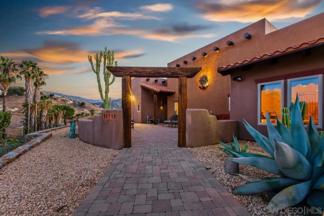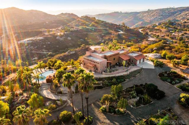 Experience the Stunning Santa Fe Estate Perched High On 8.49 Acres In A Gated Community on the West End Of Ramona’s Wine Country. Spectacular 360 Degree Views. An Amazing Pool With Pergola And Sitting Area For Absorbing The Breath Taking Views Below. Enjoy Your Favorite Beverage While Watching The Endless Sunsets From One Of The Many Patios. Split Floor Plan, Soaring Ceilings, Massive Wood Beams. Open Chef’s Kitchen, Double Ovens, 6 Burner Gas Cooktop, Granite Countertops and Custom Cabinets. Nestled within a gated community on Ramona's West End, this stunning Santa Fe Estate spans 8.49 acres and offers breathtaking 360-degree views. Ideal for relaxation, the property features an amazing pool complete with a pergola and sitting area's, perfect for enjoying the panoramic vistas and mesmerizing sunsets. Inside, the home showcases a split floor plan adorned with soaring ceilings and massive wooden beams. The open chef’s kitchen is a culinary delight, featuring double ovens, a 6-burner gas cooktop, granite countertops, and custom knotty alder cabinets. The residence includes three bedrooms, a spacious master suite, and a guest suite with a kitchenette and full bath. Designed for seamless indoor and outdoor living, every room offers stunning views of the surrounding landscape.