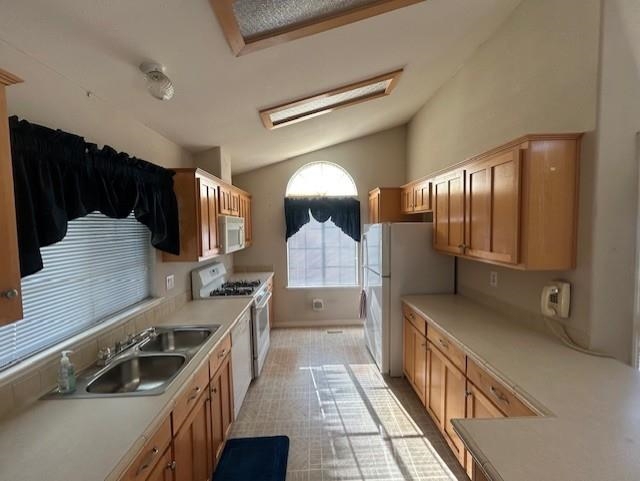 Manufactured home in Hayward Mobile Country Club (adult community 55+) has: 2 bedrooms; 2 full baths; 2 cell clear story skylight in living room; vaulted ceilings throughout; galley style kitchen; primary bedroom with private bath and walk in closet; indoor laundry room with washer and dryer included; relaxing front porch; 1 shed and more, this home is ready for it's new owners to enjoy! Fireplaces: NO