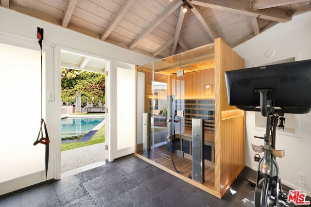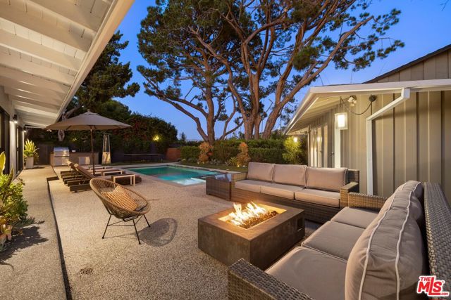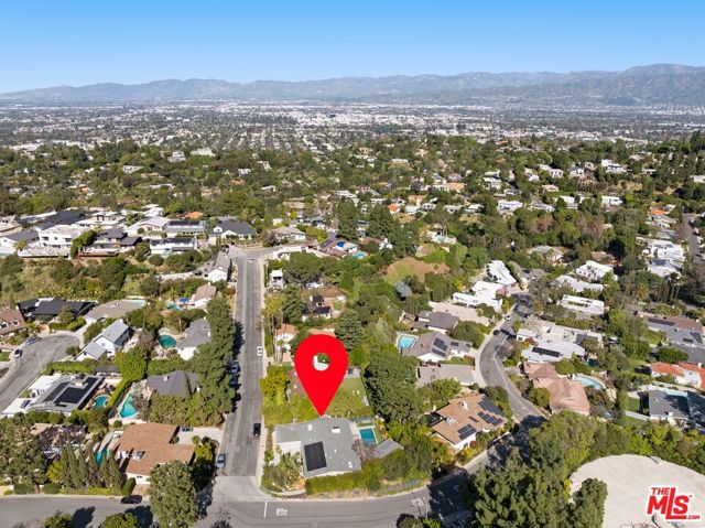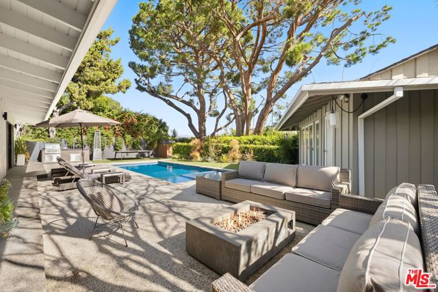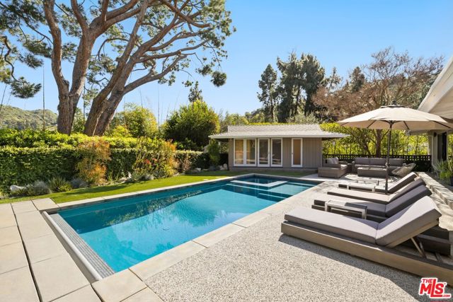 Originally built in the mid-century era, this remodeled Studio City home delivers a sharp, current take on classic California modernism. Set on a corner lot in the coveted Dona streets, the property sits minutes from Laurel Canyon's creative core, major film and television studios, and the dining, shopping, and nightlife along Ventura Boulevard and the Sunset Strip. The single-level 4BR/4BA floor plan is open and architectural, highlighted by 12-foot vaulted ceilings, strong sightlines, and walls of glass that pull in canyon light. The living room and great room are anchored by a gas fireplace wrapped in Getty stone with custom walnut shelving, creating a natural focal point for everyday living and entertaining. Sliding glass doors open directly to the outdoors, blurring the line between interior spaces and the serene setting beyond. The kitchen blends mid-century warmth with modern performance, featuring custom walnut cabinetry, a Viking range, generous pantry storage, and a leathered granite island with seating. A dedicated laundry and mud room connects to a two-car garage equipped with a workbench, sink, beverage refrigerator, and storage. The primary suite offers privacy and calm with a spa-style bath that includes an oversized dual shower, round soaking tub, and direct access to the pool and spa. The backyard is designed for effortless entertaining with a built-in outdoor kitchen, a rectilinear pool with spa, and a pool house/flex space with a fifth bathroom. Additional features include a Control4 smart home system, solar panels, EV charging, Tesla battery, and drive-up off-street parking.
