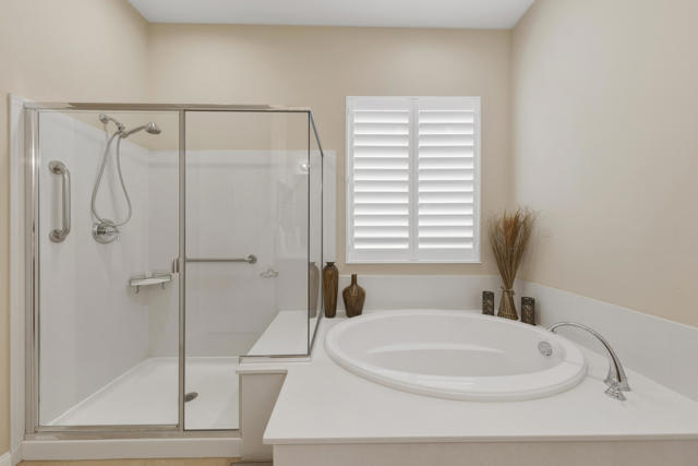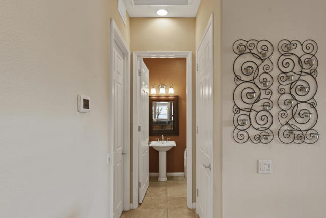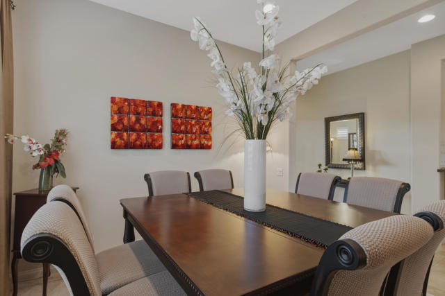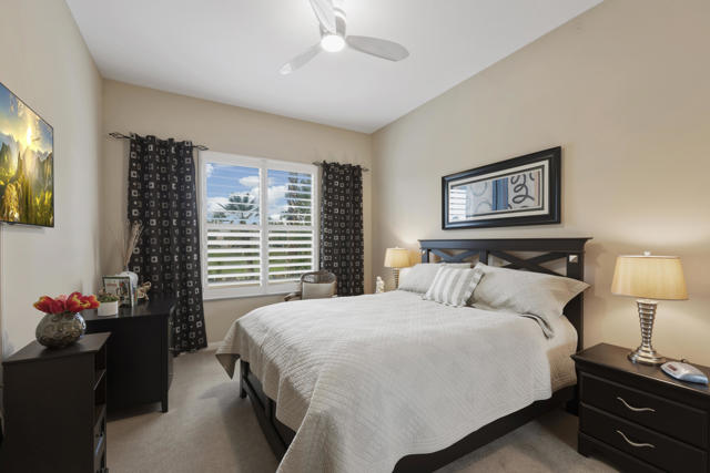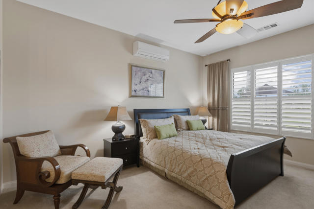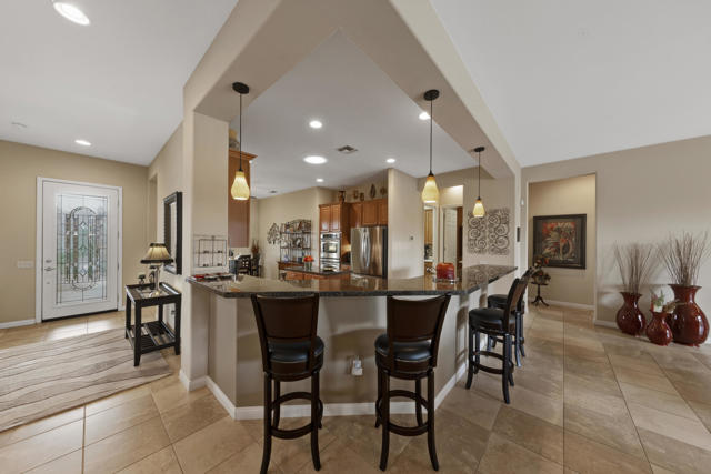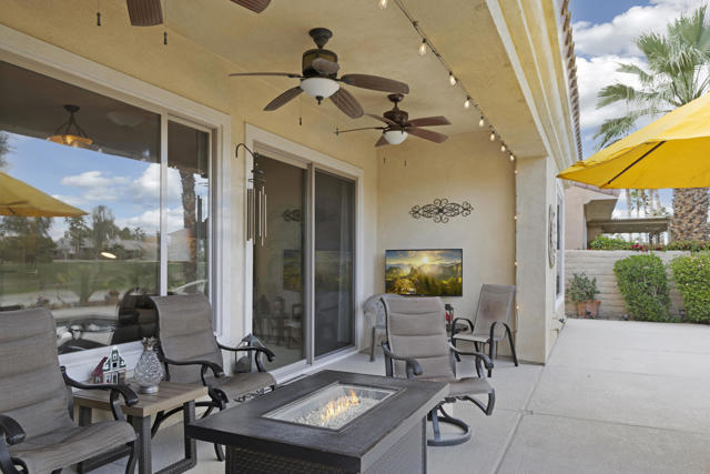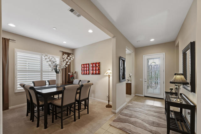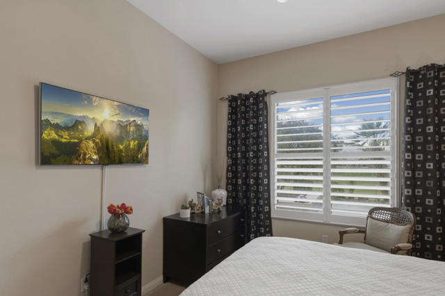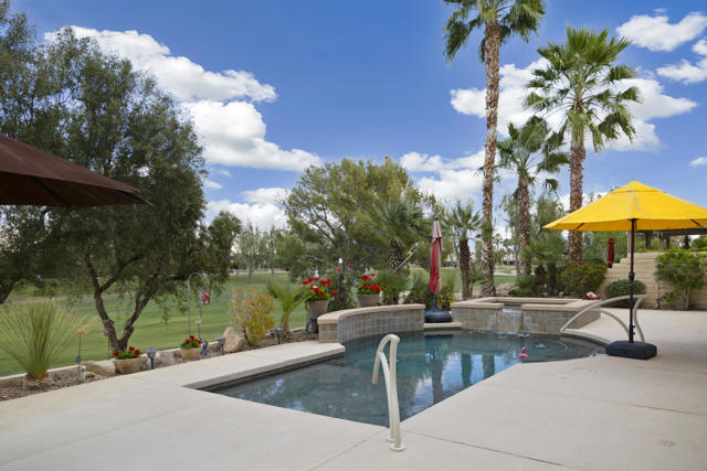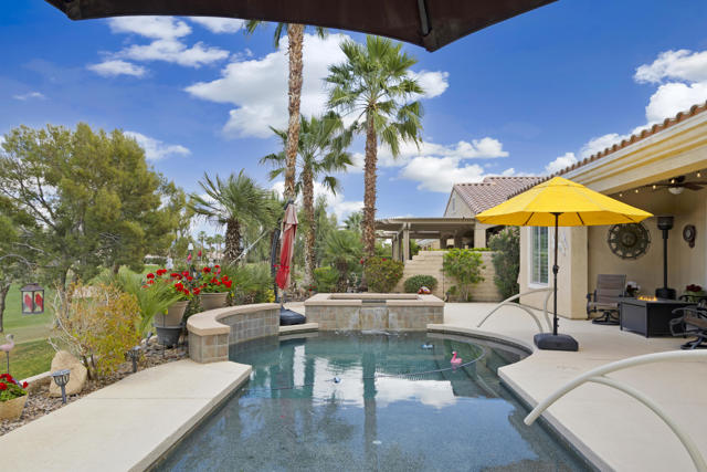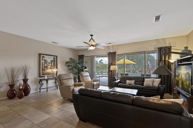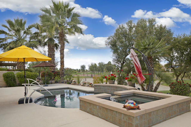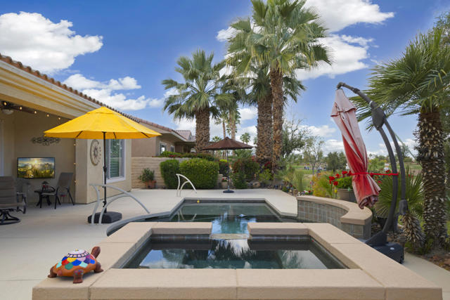 Welcome to the highly sought after Castellano model offering 2230 sqft of thoughtfully designed living space in meticulous condition. Perfectly positioned on the golf course with no golf ball exposure. This home delivers privacy, views and resort style comfort. The moment you enter through the elegant glass front door, you'll notice the quality and care throughout. Plantation shutters accent the windows and all ceramic tile flooring in the main living areas provides both sophistication and easy maintenance. The kitchen is built for entertaining and everyday living featuring: ** Wrap-around entertainment bar **Center Island **Walk in pantry ** Eating nook ** Pendent lights and Sola tube. A formal dining room offers space for hosting while the dedicated office/den provides flexibility for work or hobbies. The spacious primary suite is exactly what you would expect, generous proportions, comfort and functionality with the aded bonus of a split AC system for enhanced climate control. The second bedoom and full second bath are ideal for guests, complemented by a convenient powder room. Additional highlights include **Laundry room with cabinets and utility sink. ** 2 car garage plus golf cart garage and extra storage. ** Soft water system for entire home ** Newer HVAC system,** Newer Hot water heater,** Newer pool equipment.Step outside and enjoy beautifully landscaped front and rear yards with mature palms, a pool and spa, professional misting system, new cool coating on the patio and stunning golf course views. Walking distance to the Montecito Clubhouse. Offered turnkey furnished with a few exceptions, this home is truly move in ready. Simply bring your suitcase and start enjoying the lifestyle. This is golf course living done right!