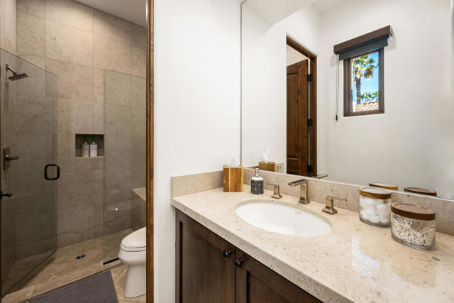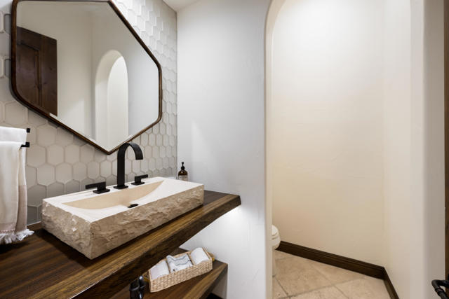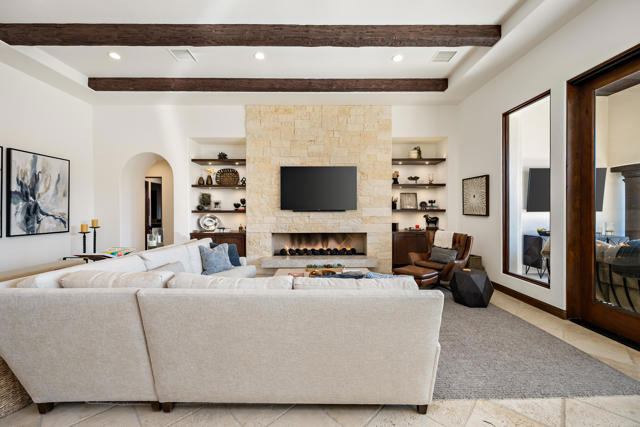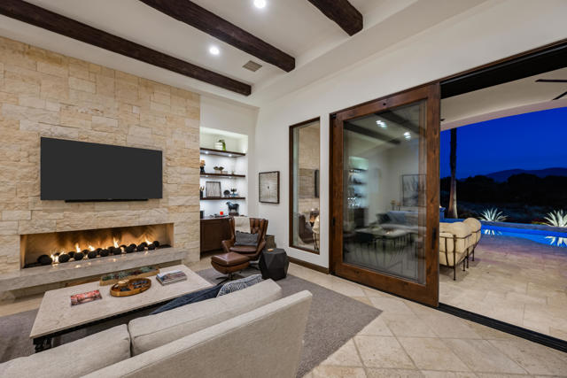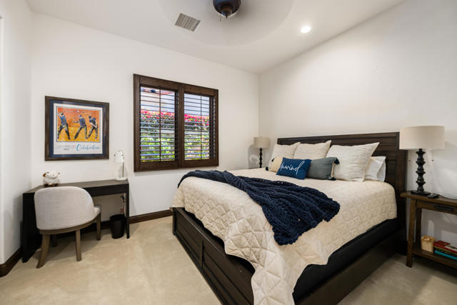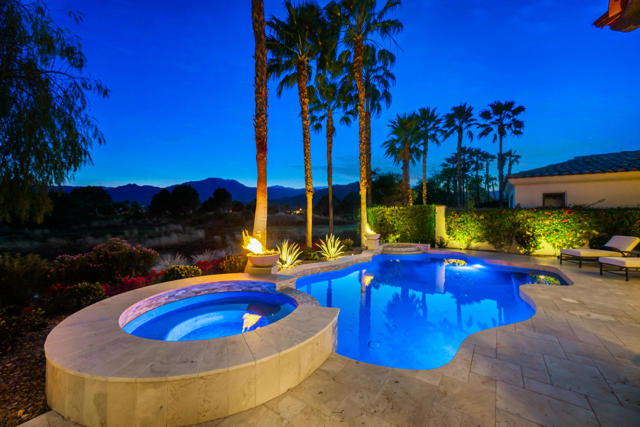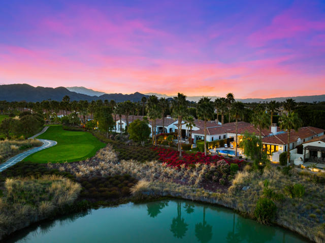 Fabulous, renovated, popular plan 2 Villa, with 3 bedrooms, 3 baths + powder room, and office, situated on the 6th hole of the Clive Clark course, behind the gates of the prestigious Hideaway Golf Club. Features include spectacular South facing VIEWS of the golf course, water and Santa Rosa mountains. This home is perched on a premium lot, and has a spacious floor plan with custom flooring, high ceilings, extensive lighting, a gourmet kitchen that overlooks a large great room and huge, centered fireplace, in a roomy 2,883 SF. There is a lovely primary suite with spa-like bath, and two additional ensuite guest rooms, plus that essential home office, with built-in murphy bed. The floor to ceiling sliding doors in the great room provides a flawless transition to the private outdoor entertaining space, which boasts a covered patio, living/dining area, built-in BBQ, and a beautiful, completely redone pool and spa with fire feature, that perfectly captures our incomparable indoor-outdoor desert lifestyle!