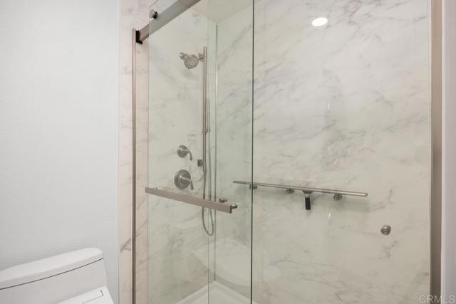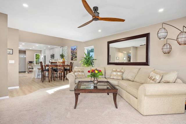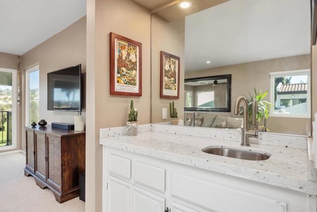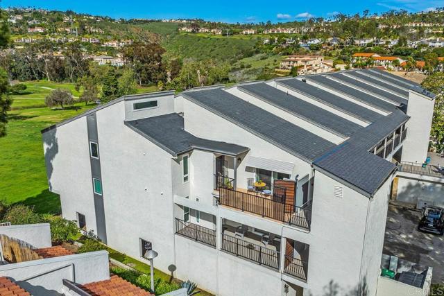 This light, bright home has been beautifully updated with contemporary touches throughout. Featuring 2-bedrooms and, 2 baths, this corner unit is located on the top floor of this 16 unit complex, offering plenty of natural light through updated dual-paned windows and large, sliding glass doors from the 2 back balconies. From the moment you enter this home your eyes will be drawn to the view overlooking the 15th Tee and 13th & 14th holes of the Omni La Costa Resort Golf Course! Evening sunsets can be breathtaking! The remodeled kitchen includes white shaker cabinetry, granite countertops, mosaic tiled backsplash, stainless appliances and extensive storage cabinets. Luxury vinyl plank flooring has been installed through most of the home with carpet in the living room.The spacious Primary bedroom with updated dual-pane sliding glass doors gives access to the private front courtyard making it a great outdoor space to enjoy your morning coffee. The en-suite bathroom has 2 separate vanities and sinks, an updated walk-in shower, plenty of linen storage and an area for a stackable washer/dryer (current washer/dryer do not convey). The complex also has a community laundry room located on the 1st floor adjacent to the elevator. The Secondary bedroom has a built-in “Murphy” bed, a walk-in closet updated with lots of shelves for storage and a 3rd patio/balcony with direct views overlooking the golf course. There is an additional bathroom conveniently located just off the guest bedroom. Other features include a gated parking garage with two dedicated spaces and storage cabinets above. The Gibraltar Villas building has been tastefully updated over the past several years. It has an elevator (recently refurbished), a new master electrical panel, a modernized and upgraded fire-alarm system and ground floor, exterior security cameras. This complex has very nice curb appeal with large trees shading the building. Common area landscaping is included in the HOA fee as is sewer, water and trash. Close to all—highly rated schools, shopping, movies, popular restaurants and only 5 minutes from the beach and trails.