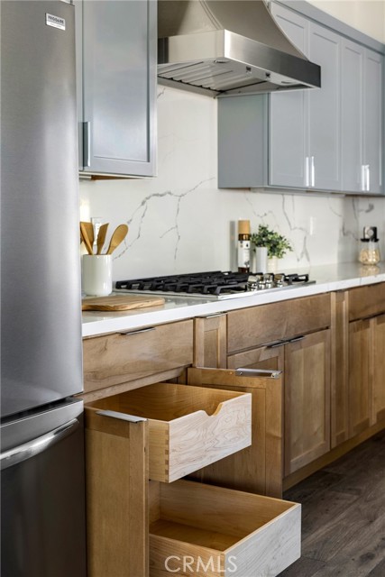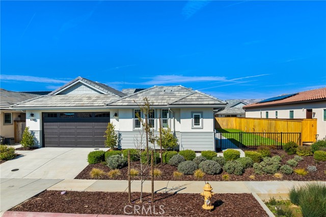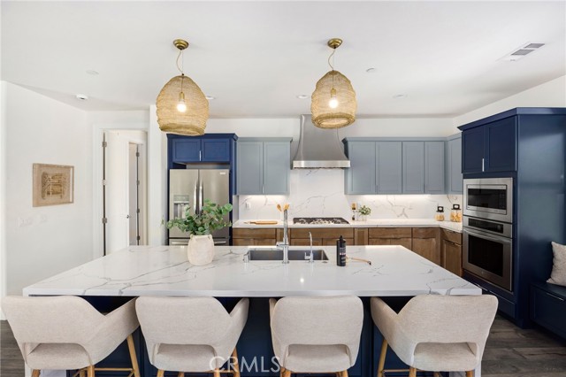 Located within the gated 55+ community of The Vintage at River Oaks, this highly upgraded Santa Ynez floor plan offers approximately 2,300 sq. ft. of total living space, including a detached casita. The main residence spans over 2,100 sq. ft. of single-level living with vaulted ceilings, oversized sliding glass doors, a sleek gas fireplace, and a custom built-in dry bar with designer cabinetry. The kitchen is centered around a dual waterfall quartz island and appointed with LG appliances, a full-height quartz backsplash, custom cabinetry with integrated storage systems, and carefully selected lighting and hardware, elevated beyond standard builder finishes. Each bathroom features illuminated mirrors, chrome fixtures, quartz countertops, and custom tile flooring and shower enclosures. The primary suite includes an oversized walk-in closet, attached bath with dual vanities, and private access to the back patio. The detached casita, just over 200 sq. ft., offers its own HVAC system, full bath, and walk-in closet, providing flexibility for guests, office use, or studio space. Outdoor areas are finished with expansive concrete patios, synthetic turf, and clean landscaping designed for minimal upkeep, while an owned solar system, two Tesla Powerwalls, and a Tesla charging station complete the property. A highly upgraded, low maintenance offering that stands apart within The Vintage.