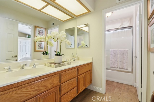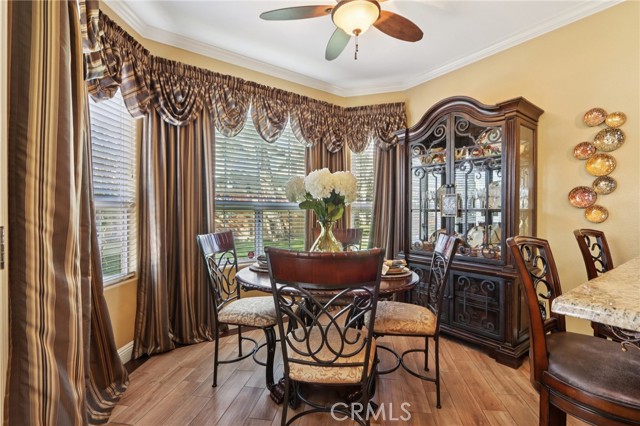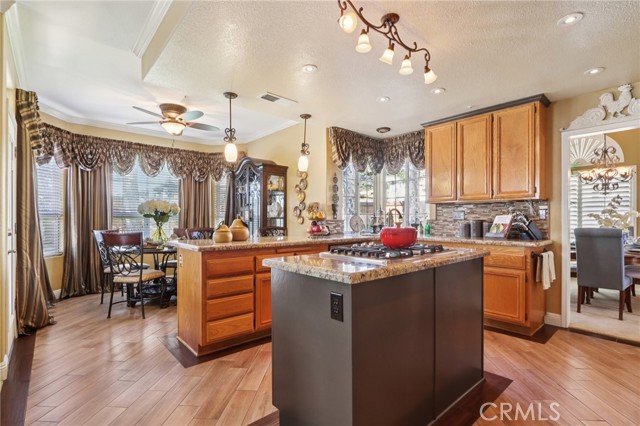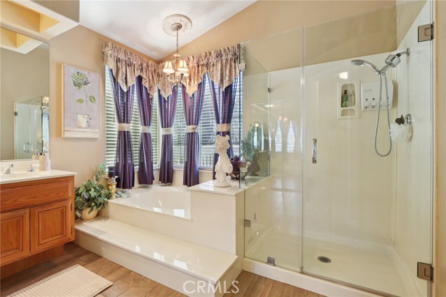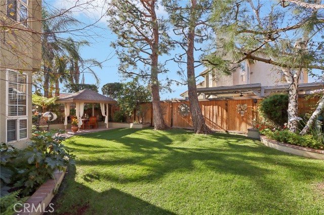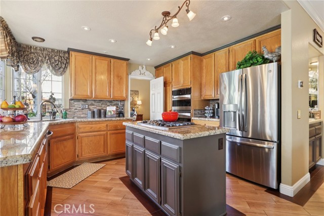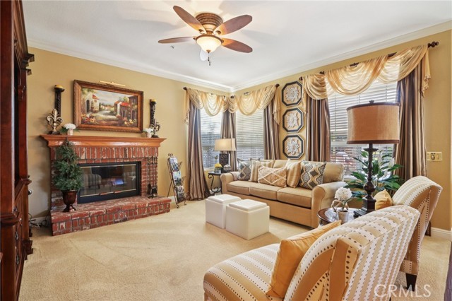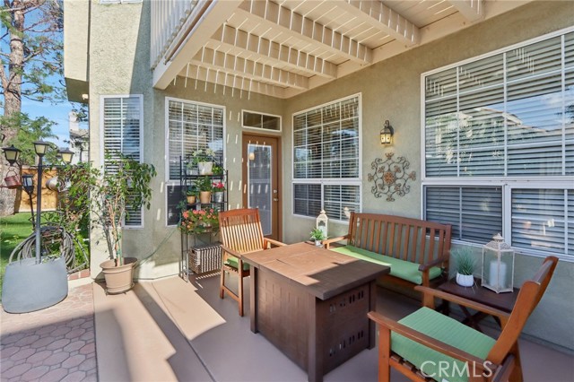 Welcome to this beautiful and spacious home offering an ideal blend of elegance, comfort, and functionality. From the moment you enter, you’re greeted by soaring vaulted ceilings and a bright formal living and dining area, enhanced by large, elegant windows adorned with classic wood shutters—perfect for inviting in natural light or creating privacy when desired. The warm and inviting family room sits just off the kitchen and features a charming brick-framed fireplace, creating the perfect gathering space. The expansive kitchen is designed for both everyday living and entertaining, showcasing granite countertops, stainless steel appliances, a center island with breakfast bar seating, and a sunny breakfast nook. A main-level bedroom with built-ins and a full bathroom offers flexibility for guests, multigenerational living, or a home office. Upstairs, you’ll find three additional spacious bedrooms and two bathrooms, including an oversized primary suite retreat. This private sanctuary features its own built-in fireplace, balcony access, and a luxurious en-suite bathroom complete with a spacious vanity, soaking tub, and separate glass-enclosed shower. Go outside to a gorgeous, park-like backyard with lush landscaping, mature trees, planters, and a producing lemon tree. Enjoy outdoor living under the covered patio and additional covered paver patio seating area—perfect for relaxing or entertaining year-round. Additional highlights include an attached 3-car garage, a laundry room with sink and cabinetry, and three exterior storage sheds (one large and two small) included with the property. Located within a desirable master-planned community offering a park, swimming pool, tennis, and pickleball courts, this home delivers exceptional space, amenities, and lifestyle.