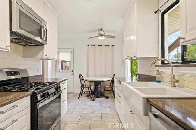 Move-in-ready single-story mid-century home nestled on a quiet cul-de-sac in a desirable Ontario neighborhood. Offering 4 bedrooms, 2 bathrooms, and 1,724 square feet of living space on a flat, private 7,540-square-foot lot, this property combines comfort, style, and functionality. Fantastic curb appeal welcomes you, while leased solar panels and a newer A/C system add energy efficiency and peace of mind. Inside, the spacious floor plan features recessed lighting, wood and tile flooring, and a warm brick fireplace anchoring the living room, which flows seamlessly into a versatile bonus/family room - ideal for gatherings or flexible living. The updated kitchen is thoughtfully designed with quartz countertops, a subway tile backsplash, stainless steel appliances (including a brand-new stove and dishwasher), an apron-front sink, and a cozy breakfast nook. The refrigerator and microwave are included. All four bedrooms are generously sized. The primary suite offers a private bathroom with a walk-in shower, while the three secondary bedrooms share a full hall bath. Enjoy year-round relaxation in the large enclosed patio, or step outside to a private backyard featuring a lush green lawn and block wall fencing - perfect for entertaining, play, or quiet evenings at home. Additional highlights include an attached two-car garage with laundry hookups and an included washer and dryer. With no HOA and a convenient location near schools, shopping, and dining, this home is ready for its next chapter and offers the perfect blend of comfort and convenience. Schedule your private tour today.